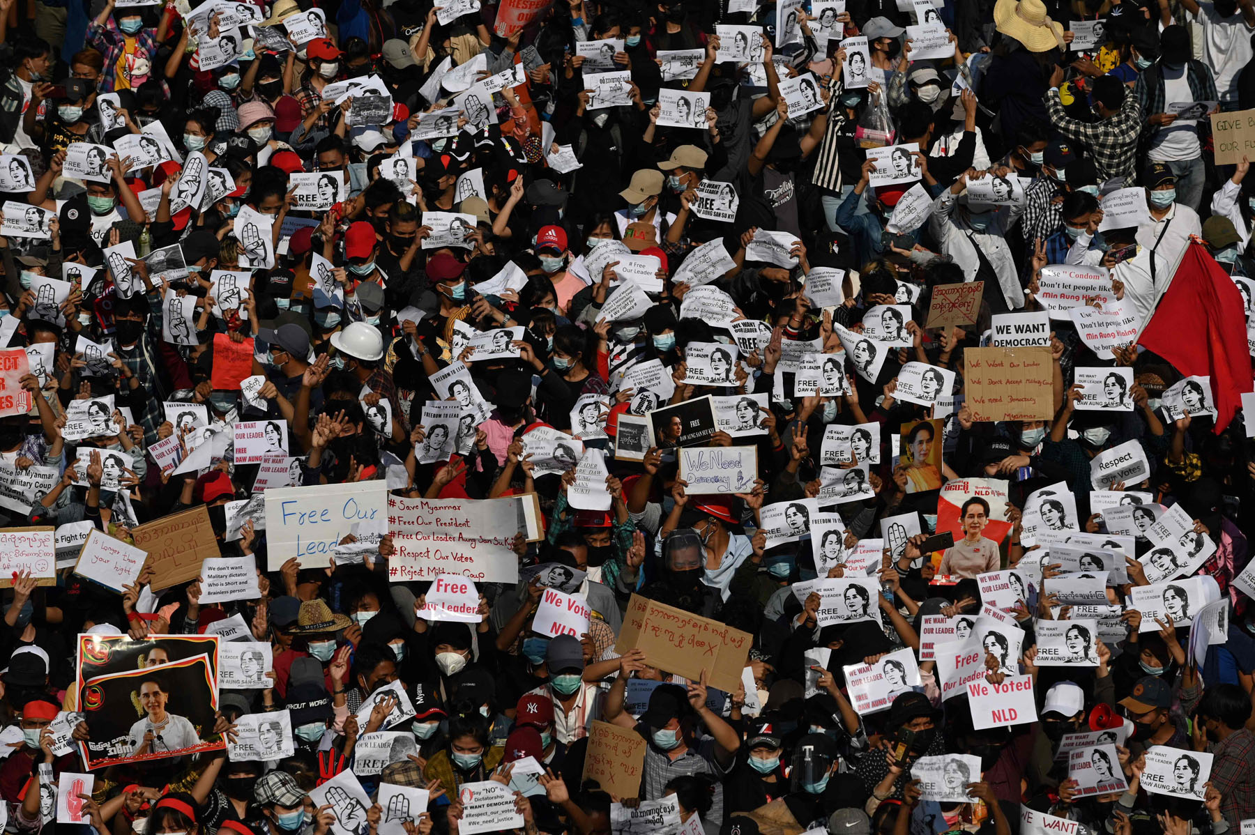 याङ्गुन । पाँच जनाभन्दा धेरै एकै ठाउँमा भेला हुन नपाउने गरी सैनिक सरकारले सोमबार राति देखि लागू गरेको कफ्र्यु (निषेधाज्ञा) को राजधानी नेपिद्अ, प्रमुख व्यापारिक सहर याङ्गुन, मान्डलेसहित देशभरका प्रमुख सहरमा अवज्ञा भएको छ । हजारौंको संख्यामा म्यान्मारवासीहरू सडकमा उत्रेर सैनिक शासनको विरोध गरेका छन् । नेतृ आङ सान सू चीसहित सैनिक नियन्त्रणमा रहेका सबैको रिहाइको माग गरिहरेका छन् । सोमवार अपराह्नसम्म १३४ जना सैनिक नियन्त्रणमा रहेको भनिए पनि सोमबार साँझदेखि मंगलबार अपराह्नसम्म पनि गिरफ्तारी जारी रहेकाले थप अधिकारकर्मी, नेता र प्रदर्शनकारी प्रहरी नियन्त्रणमा पुगेको प्रमुख पार्टी नेशनल लीग फर डेमोक्रेसी (एनएलडी)ले जनाएको छ । गत नोभेम्बरमा भएको चुनावमा एनएलडीले ८३ प्रतिशत मत ल्याए पनि सेनाले त्यो चुनावमा अनियमितता भएको भन्दै स्वीकार नगर्ने बताएको छ । सैनिक प्रमुख मीन आङ लाइङले सोमबार राति सैनिक टेलिभिजनमार्फत देशवासीलाई सम्बोधन गर्दै देशलाई सही मार्गमा लग्न सेनाले संविधान अनुसारै शासनभार ग्रहण गरेको र यसमा सबैलाई समर्थन गर्न आह्वान गरे ।