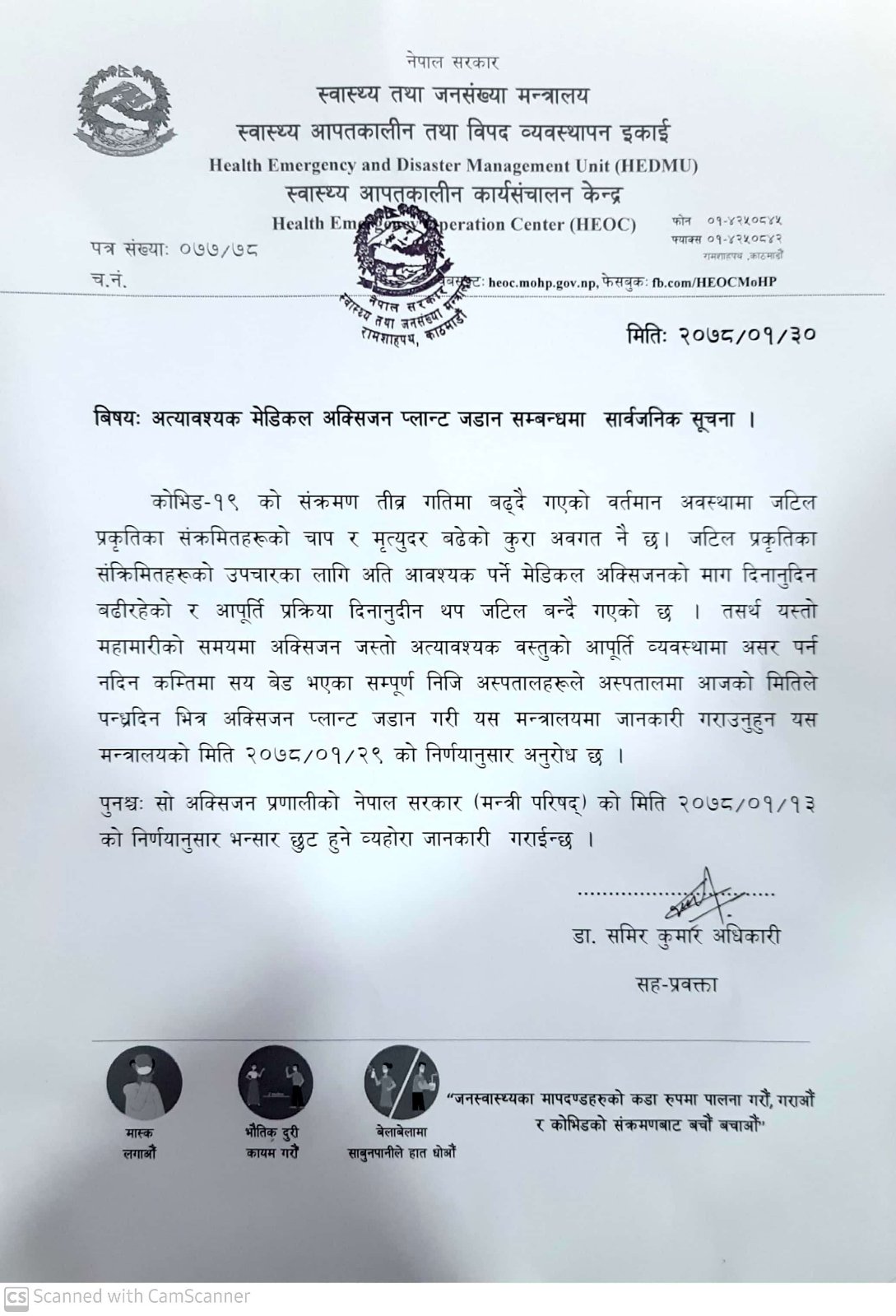 काठमाडौं । सरकारले जटिल प्रकृतिका कोरोना संक्रमितको उपचारका लागि आवश्यक पर्ने मेडिकल अक्सिजनको व्यवस्थाका लगि अस्पतालमा नै १५ दिनभित्र प्लान्ट जडान गर्न निर्देशन दिएको छ । स्वास्थ्य तथा जनसंख्या मन्त्रालयका सहप्रवक्ता डा.समिरकुमार अधिकारीका अनुसार महामारीका समयमा अक्सिजन जस्तो अत्यावश्यक वस्तुको आपूर्ति व्यवस्थामा असर पर्न नदिन कम्तीमा सय शय्या भएका सम्पूर्ण निजी अस्पतालले आजको मितिले १५ दिनभित्र अक्सिजन प्लान्ट जडान गरी जानकारी गराउन अनुरोध गरिएको छ । यही वैशाख १३ गतेको मन्त्रिपरिषद्को निर्णयानुसार अक्सिजन प्लान्ट निर्माण गर्ने सामग्रीमा भन्सार छुट दिने निर्णय भएको छ । मेडिकल अक्सिजनको माग बढेको तथा आपूर्ति प्रक्रिया दिनानुदिन जटिल बन्दै गएका अवस्थामा मन्त्रालयका तर्फबाट यस्तो आग्रह गरिएको सहप्रवक्ता अधिकारीको भनाइ छ ।