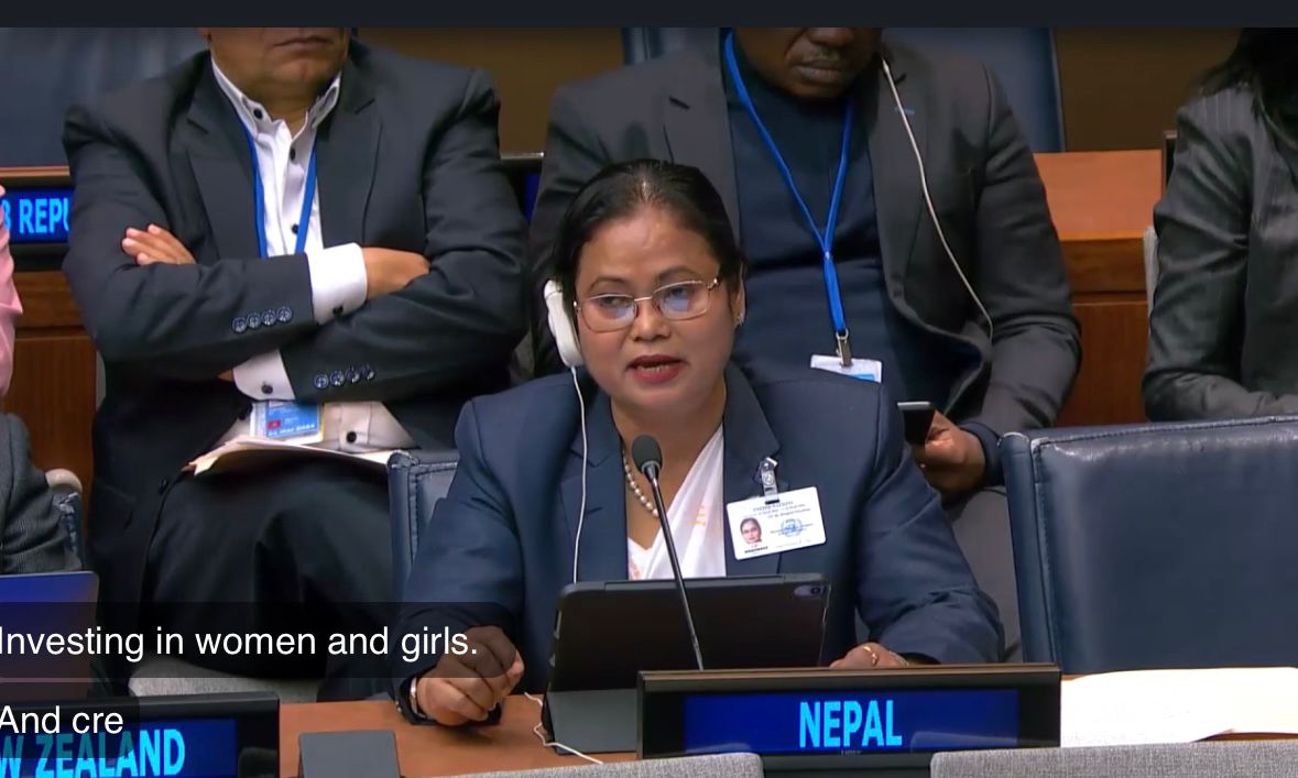 नेपालको संविधानले महिला र युवतीहरुको पारिवारिक मामिला र सम्पत्तिको हक लगायत मौलिक हकको प्रत्याभूति गरेको भन्दै मन्त्री चौधरीले नेपालमा महिला र युवतीहरुको संघीय र प्रादेशिक संसदको ३३ प्रतिशत, स्थानीय सरकारमा ४० प्रतिशत सिटको ग्यारेन्टी गरेको उल्लेख गरिन् । ‘हामीले हाम्रो विकास प्रयासमा लैङ्गिक समानता र महिला सशक्तिकरणलाई प्राथमिकता दिएका छौं । १६ औं पञ्चवर्षीय आवधिक योजनामा लैङ्गिक जवाफदेही शासन प्रणालीलाई समावेश गर्न प्रतिबद्ध छौं’, उनले भनिन् । मन्त्री चौधरीले जमिन र सम्पत्तिमा एक तिहाइ महिलाको स्वामित्व रहेको बताउँदै लघु, साना र मझौला उद्यममा महिलाहरुको सहभागिता बढिरहेको जिकीर गर्दै कबि ४५ प्रतिशत साना घरेलु उद्योगहरु महिलाहरुद्वारा सञ्चालित रहेको चर्चा गरिन् । ‘करिब ४५ प्रतिशत लघु, साना र मझौला उद्योगहरु महिलाद्वारा सञ्चालित छन् । सहकारीमा ५६ प्रतिशत महिला छन् । यसले आर्थिक स्वतन्त्रतालाई दिगो बनाउन योगदान गरेको छ ।’ यति प्रगति भएपनि गरिबी सम्बोधन गर्न श्रोतसाधनको अभाव भएकाले असमानताहरु रहेको उनको भनाई छ । साथै, मन्त्री चौधरीले नेपाल अन्तर्राष्ट्रिय समुदायसँग मिलेर काम गर्न, लैङ्गिक समानता र सबै महिला र युवतीहरूको सशक्तिकरण, शिक्षा, रोजगारी, उद्यमशीलता, स्रोत र सम्पत्तिमा समान पहुँच प्रदान गर्न, संस्था र क्षमताको कमीलाई सम्बोधन गर्न, महिला तथा बालिकाको विकासमा लगानी गर्न प्रतिबद्ध रहेको उल्लेख गरिन् ।