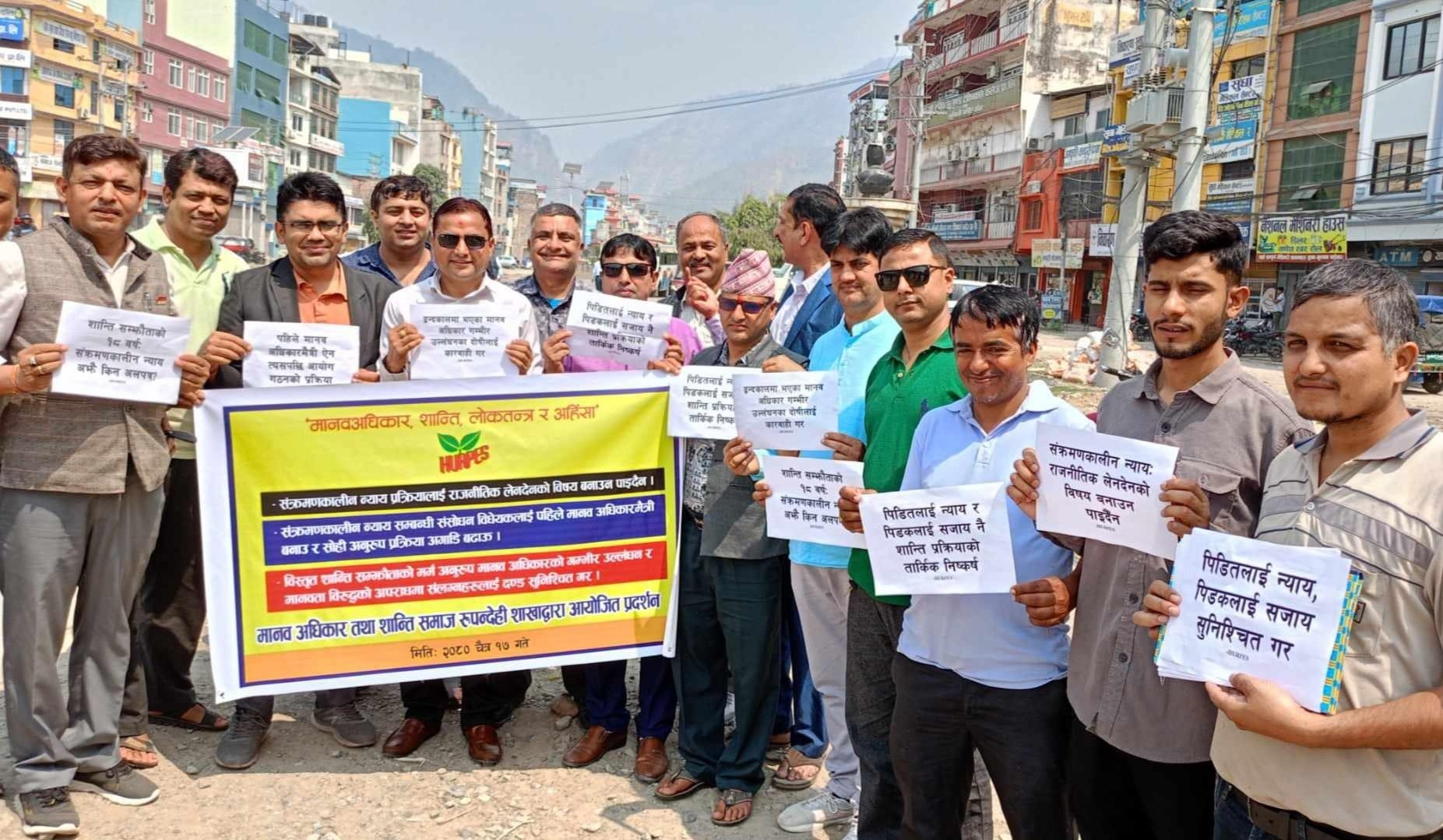 काठमाडौं । संक्रमणकालीन न्याय प्रक्रिया टुंगोमा पुर्याउन माग गर्दै मानव अधिकार तथा शान्ति समाजले शनिबार २० जिल्लामा दबाबमूलक प्रदर्शन गरेको छ । समाजले सो प्रक्रियालाई राजनीतिक लेनदेनको विषय बनाउन खोजिएकोप्रति चिन्ता समेत व्यक्त गरेको छ । विस्तृत शान्ति सम्झौता सम्पन्न भएको १८ वर्ष पुग्न लाग्दा पनि संक्रमणकालीन न्याय प्रक्रिया टुङ्गोमा नपुग्नु दुखद रहेको समाजका सचिव लक्ष्मीनारायण मिश्रले बताए । ‘संक्रमणकालीन न्याय प्रक्रियालाई राजनीतिक लेनदेनको विषय बनाइनुहुदैन । यसमा पीडितलाई न्याय र पीडकलाई समाजको सुनिश्चितता हुनुुपर्छ,’ सचिव मिश्रले भने, ‘हामीले त्यही विषयलाई केन्द्रमा राखेर छिटोभन्दा छिटो पीडितले न्याय पाउने अवस्थाको सुनिश्चितता गर्न दबाबस्वरुप देशभरका विभिन्न २० जिल्लामा एकैसाथ प्रदर्शन गरेका छौँ ।’ उनका अनुसार काठमाडौं, रुपन्देही, पाल्पा, दाङ, चितवन, सुर्खेत, ललितपुर, महोत्तरी, गुल्मी, संखुवासभा, नवलपुर, बागलुङ, तेह्रथुम, म्याग्दी, बाँके, सल्यान, बारा, कपिलवस्तु, दैलेख र कैलाली शाखाले शनिबार प्रदर्शन गरेका छन् । प्रदर्शनमा सहभागीहरूले द्धन्द्धकालीन मानव अधिकार गम्भीर उल्लंघनका दोषीलाइृ कारबाही गर्न र द्धन्द्धकालमा भएका मानवताविरुद्धको अपराधमा संलग्नहरुलाई कारबाही गर्न माग गर्दै विभिन्न प्ले–कार्डहरू समेत प्रदर्शन गरेका थिए । शान्ति समाजले हरेक वर्ष चैत १७ गते हिंसाको खारेजी र दण्डहीनताको अन्त्यमा जोड दिँदै कार्यक्रम गर्दै आएको छ ।