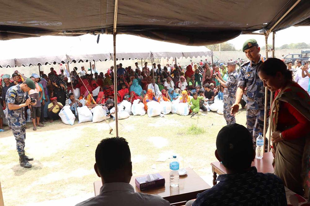 महोत्तरी । महोत्तरी जिल्ला मटिहानी नगरपालिका–६ जरलहवा गाँउ बस्तीमा आगलागीबाट प्रभावित भएका स्थानीयहरुलाई सशस्त्र प्रहरी परिवार महिला संघले राहत बितरण गरेको छ । संघकी अध्यक्ष श्रीमती अनिता लामिछाने अर्यालबाट आगलागी पिडितहरुलाई राहत सामाग्री वितरण तथा सामुहिक खानाको कार्यक्रम गरिएको हो । सशस्त्र प्रहरी परिवार महिला संघले स्थापना कालदेखी मानविय सहयोग कार्यमा केन्द्रित रहि विभिन्न समयमा घटेका विपद्का घटनाहरुमा सक्दो राहतका कार्यक्रमहरु संचालन गर्दै आईरहेको छ, त्यसैको निरन्तरता स्वरुप मटिहानीमा राहत तथा सामुहिक भोजनको कार्यक्रम संचालन गरिएको थियो । १ सय ३ घरधुरी आगलागी पिडितहरुका प्रत्येक परिवारमा कम्बल, सिरानी, टावेल, पानी खाने बोतल, जग, माक्स, स्टिलको कचौरा, गिलास, थाल, चम्चा, वयक्तिगत सरसफाई किट (पुरुष/महिला) तथा सामुहिक रुपमा प्रयोग गर्नेगरी १०/१० थान शौचालय, प्यान तथा पाईप÷एल्बो लगाएतका राहत सामाग्रीहरु वितरण गरिएको थियो । राहत सामाग्री वितरण कार्यक्रम पश्चात ७ सय जना आगलागी पिडितहरुलाई सामुहिक खाना समेत खुवाईएको थियो । कार्यक्रममा सशस्त्र प्रहरी बल, नेपाल नं. २ छिन्नामस्ता बाहिनी मुख्यालय महोत्तरीका बाहिनीपति सशस्त्र प्रहरी नायव महानिरीक्षक दीपेन्द्र शाह, मधेश प्रदेश सशस्त्र प्रहरी परिवार महिला संघकी अध्यक्ष श्रीमती प्राब्दा सिंह शाह, जिल्लास्थित सुरक्षा निकायका प्रमुखहरु लगाएत जनप्रतिनिधिहरु, स्थानीय भद्रभलाद्मी तथा संचारकर्मीहरुको उपस्थिति रहेको थियो ।
