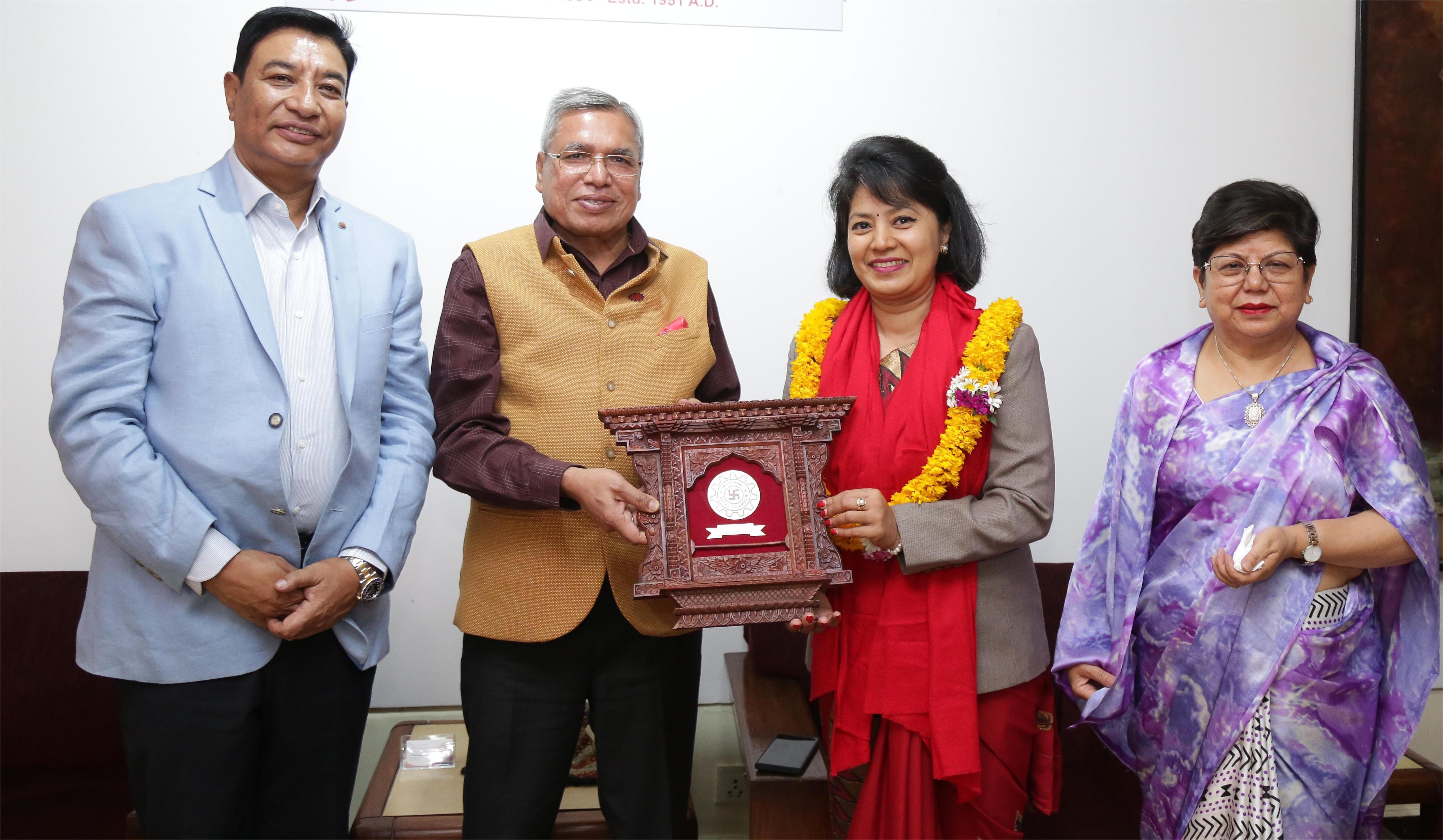 काठमाडौं । नेपाल महिला चेम्बरले संस्थापक अध्यक्ष डा. अन्जान शाक्यलाई सम्मान गरेको छ । राष्ट्रियसभा सदस्यमा मनोनित डा शाक्यलाई महिला चेम्बरले सम्मान गरेको हो । डा. शाक्य महिला चेम्बरको संस्थापक अध्यक्ष हुन् । महिला चेम्बरकी अध्यक्ष उर्मिला श्रेष्ठ, चेम्बर अफ कमर्सका अध्यक्ष कमलेश कुमार अग्रवाल एवं चेम्बर सल्लाहकार परिषदका अध्यक्ष राजेशकाजी श्रेष्ठले डा. शाक्यलाई संयुक्त रुपमा सम्मान गरे । महिला चेम्बरकी अध्यक्ष उर्मिला श्रेष्ठले डा. शाक्यलाई राष्ट्रियसभाबाट महिला सशक्तीकरणको मुद्धा उठाउन आग्रह गरिन् । महिलाको उद्यमशिलता विकासका लागि कानूनी र संरचनागत सुधारको आवश्यक्ता रहेको अध्यक्ष श्रेष्ठको भनाई छ । अध्यक्ष श्रेष्ठले महिला चेम्बर अभियान र महिला उद्यमशिलता विकासमा डा. शाक्यको भूमिकाको प्रशंसा गरिन् । चेम्बर अध्यक्ष कमलेश अग्रवालले राष्ट्रियसभामा निजी क्षेत्रको आवाज उठाउन डा. शाक्यलाई सुझाव दिए । महिला चेम्बर मार्फत महिला उद्यमशिलता एवं शसक्तीकरणका लागि चेम्बरले महत्वपुर्ण भूमिका निर्वाह गर्दै आएको अध्यक्ष अग्रवालको भनाई छ ।