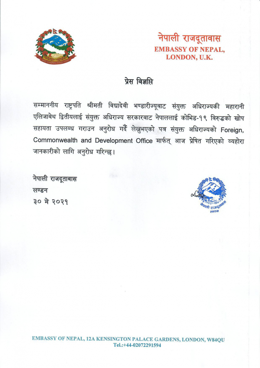काठमाडौं । राष्ट्रपति विद्यादेवी भण्डारीले कोभिड १९ विरुद्धको खोप सहायता उपलब्ध गराउन अनुरोध गर्दै बेलायती महारानी एलिजाबेथ द्धितियालाई पत्राचार गरेकी छिन् । राष्ट्रपतिको पत्रलाई आइतबार लन्डन दूतावासले बेलायती बिदेश मन्त्रालयमा बुझाइएको छ । राष्ट्रपतिले खोप कूटनीति अन्तर्गत आइतबारै रुसी समकक्षी भ्लादिमिर पुटिनलाई पनि पत्राचार गरेकी छिन् । अमेरिकी समकक्षी जो बाइडेन र भारतीय समकक्षी रामनाथ कोविन्दलाई पनि पत्र लेखेकी छिन् ।