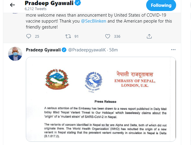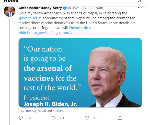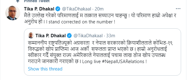 'सम्माननीय राष्ट्रपतिज्यूको अग्रसरता र नेपाल सरकारको क्रियाशीलताले कोभिड-१९ विरुद्धको खोप प्राप्तिमा आज अर्को सफलता प्राप्त भएको छ िहाम्रो अनुरोधलाई स्वीकार गर्दै संयुक्त राज्य अमेरिकाले नेपाललाई पचास लाख डोज खोप उपलब्ध गराउने जानकारी गराएको छ' ढकालले ट्वीटरमा लेखेको छन् ।