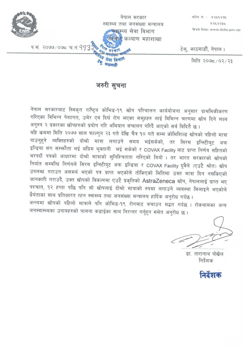 ‘भारत सरकारको खोपको निर्यात सम्बन्धि निर्णयले सिरम इन्स्टिच्युट अफ इन्डिया र कोभ्याक्स फेसिलिटीबाट खोप उपलब्ध गराउन असमर्थ भएको पत्र प्राप्त भएकोले तोकिएको मितिमा उक्त मात्रा दिन नसकिएको जानकारी गराउदै, उक्त खोपको विकल्पमा एउटै प्रकृतिको अस्ट्राजेनेका खोप, नेपाललाई प्राप्त भए पश्चात, १२ हप्ता पछि पनि सो खोपलाई दोस्रो मात्राको रुपमा लगाउने व्यवस्था मिलाइने भएकोले धैर्यताका साथ प्रतिक्षारत रहन स्वास्थ्य तथा जनसंख्या मन्त्रालय हार्दिक अनुरोध गर्दछ,’ विज्ञप्तिमा भनिएको छ। सरकारले २०७७ फाल्गुन २३ गते देखि चैत १० गतेसम्म कोभिशिल्ड खोपको पहिलो मात्राको खोप लगाएको थियो। दोस्रो मात्रा लगाउने समय भइसकेको अवस्थामा भारत सरकारको खोपको निर्यात सम्बन्धि निर्णयले सिरम र कोभ्याक्स दुवैले खोप उपलब्ध गराउन असमर्थ भएको पत्र नेपाल सरकारलाई पठाएका थिए। सोही अनुसार सरकारले विकल्पको रुपमा अस्ट्राजेनेका खोपको प्रयोग गर्न लागेको हो।