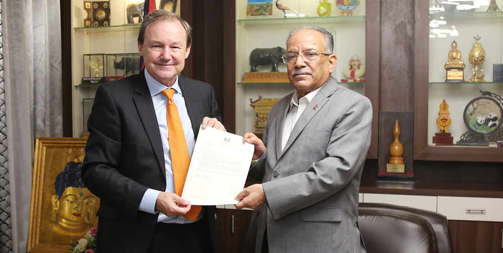 काठमाडौं । पूर्व प्रधानमन्त्री एवं नेपाल कम्युनिस्ट पार्टी (माओवादी केन्द्र) का अध्यक्ष पुष्पकमल दाहाल "प्रचण्ड"सँग नेपालका लागि संयुक्त अधिराज्य बेलायतका राजदूत रोब फेनले भेट गरेका छन् । शुक्रबार बिहान खुमलटारमा भएको भेटमा राजदूत रोबले नेपालले शान्ति प्रक्रिया र संक्रमणकालीन न्याय सम्बन्धी विधेयक टुंगोमा पुर्याउन लागेकोमा खुसी व्यक्त गर्दै शान्ति प्रकियाको पूर्णताका निम्ति बेलायत सरकारको पूर्ण सहयोग रहने बताए । भेटमा अध्यक्ष प्रचण्डले नेपालको प्रतिनिधिसभाले पीडितमैत्री न्यायमा जोड दिँदै संक्रमणकालीन न्यायसम्बन्धी विधेयक पारित गरेको बताउँदै पीडितमैत्री न्याय र सम्मानका लागि आवश्यक पर्ने क्षेत्रमा बेलायत सरकारको सहयोग रहने विश्वास व्यक्त गरे । अध्यक्ष प्रचण्डले आफू सरकारको नेतृत्वमा रहँदा संक्रमणकालीन न्याय सम्बन्धी विधेयक अघि बढाउन पहल लिएको बताउँदै विधेयक निष्कर्षमा पुग्दा त्यसले विश्वशान्तिका निम्तिसमेत योगदान पुग्ने बताए । उनले आफ्नो प्रधानमन्त्रीत्वकालमा अन्तरार्ष्ट्रिय सम्बन्ध सुदृढ गर्न विशेष पहल लिएको स्मरण गर्दै जलवायु न्याय लगायतका क्षेत्रमा नेपालले नेतृत्वदायी भूमिका खेलेको बताए । भेटका क्रममा अध्यक्ष प्रचण्डले गोर्खाजहरूले उठाउँदै आएका सवालहरू बेलायती सरकारबाट सम्बोधन हुने विश्वाससमेत व्यक्त गरे । भेटमा राजदूत फेनले अध्यक्ष प्रचण्डको बलमा शान्ति प्रक्रियाले पूर्णता पाएकोमा बधाइ दिँदै नेपालका लागि आवश्यक सहयोगमा बेलायतको सधै सहयोग रहने बताए । फेनले बेलायती नागरिकहरूमा नेपाली उत्पादनप्रति रूचि बढेको बताउँदै पारस्परिक सहयोग र व्यापारमा समेत साझेदारी बढाउन सकिने बताए । उनले प्रचण्डको कार्यकालमा लगानीअनुकूल कानुन संशोधन र लगानी सम्मेलन सम्पन्न भएकोमा खुसी व्यक्त गर्दै नेपालमा वैदेशिक लगानी भित्राउन आफ्नो योगदान रहने बताए ।