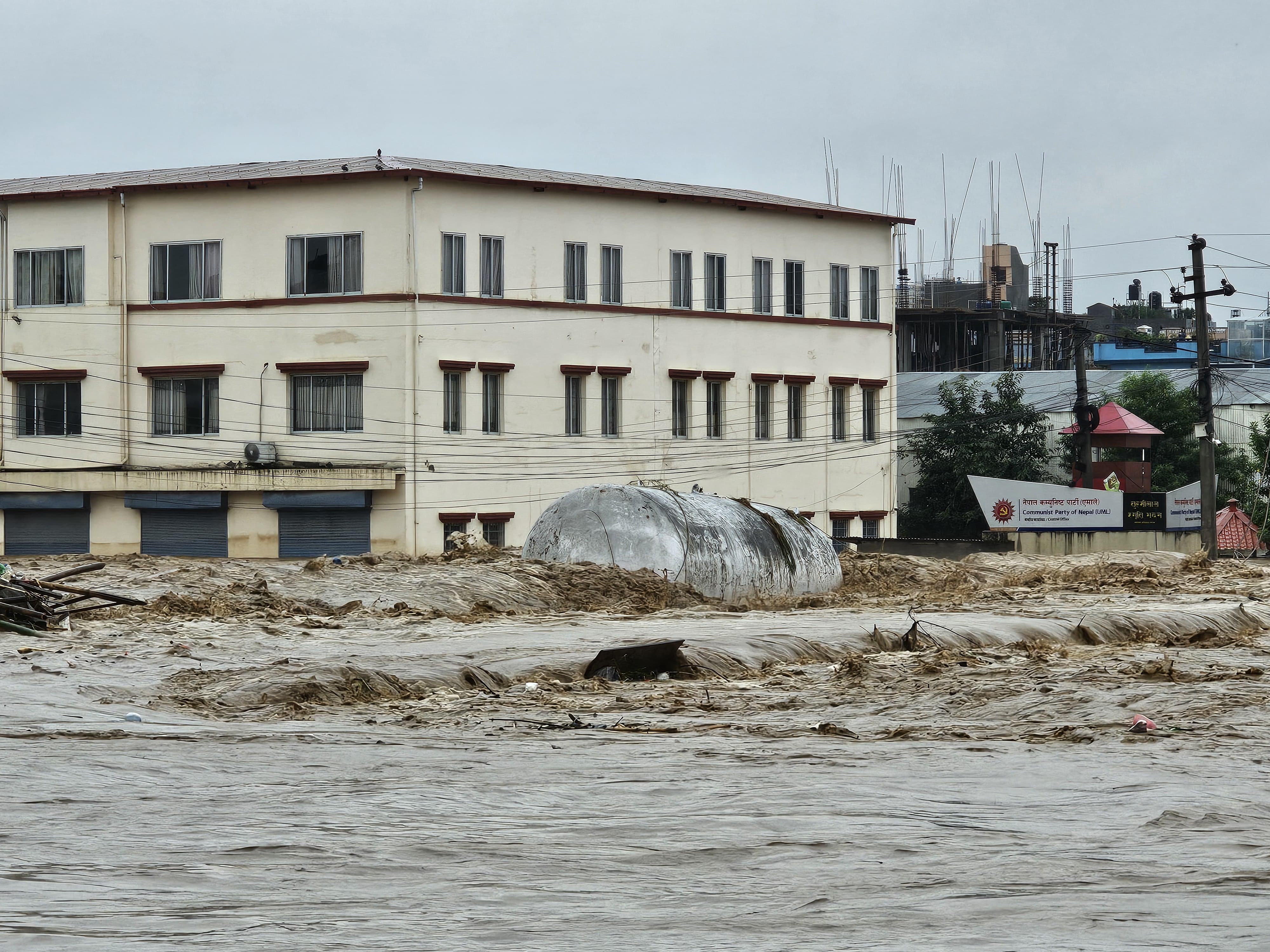 ललितपुर । च्यासलस्थित एमाले मुख्यालय र पुष्पलाल स्मृति भवन डुबानमा परेको छ । गएरातिदेखि परेको अविरल वर्षाका कारण मनोहरा र बागमती नदीमा आएको बाढीले सो क्षेत्र डुबानमा परेको हो । ललितपुरस्थित नेकपा एमालेको केन्द्रीय कार्यालय र च्यासल फुटबल ग्राउन्ड मनोहरा खोलाको बाढीका कारण हरेक वर्ष डुबानमा पर्ने गरेका छन् । अविरल वर्षासँगै बाढीले एउटा ग्यास बुलेट समेत बगाएको छ । ग्यास चुहिँदै गरेको अवस्थामा शनिबार बिहान उक्त बुलेट च्यासलस्थित एमाले पार्टी कार्यालय नजिकैको पुलमा अड्किएको छ । भक्तपुरतर्फबाट बगाएर ल्याएको उक्त बुलेट बाढीमा बग्दै गर्दा ग्यास निस्केर माथितिर गइरहेको देखिन्छ । ग्यास चुहिएकाले सो क्षेत्रका स्थानीय त्रसित बनेका छन् भने ग्यासको चर्को गन्ध आइरहेको छ ।