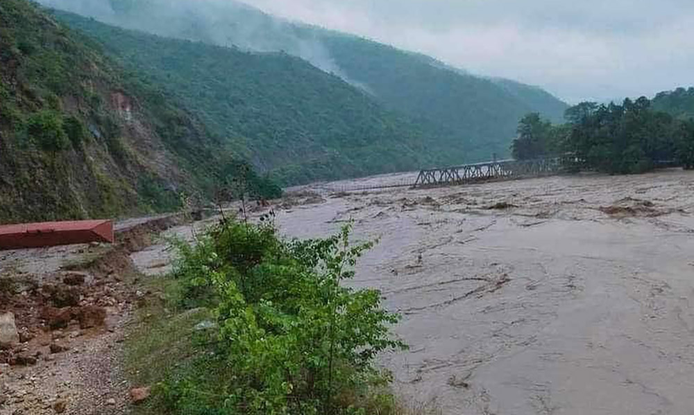 सिन्धुली । तीन दिन देखिको निरन्तर अविरल बर्षाले सुनकोसी नदीमा आएको बाढीले सिन्धुली-रामेछाप जोड्ने खुर्कोटको पक्की पुल बगाएको छ । बाढीले गोलन्जोर गाउँपालिका वडा नम्बर ७ स्थित खुर्कोटको तल्लो बजार, खुर्कोट बसपार्क पूर्णरुपमा डुबाएको प्रहरीले बताएको छ । साथै सुनकोसी नदीलगायत सिन्धुली जिल्लाको विभिन्न खोला र नदीहरुमा आएको बाढीले सिन्धुलीका विभिन्न स्थानहरु डुबानमा रहेकोले सतर्क रहन स्थानीय प्रशासनले आग्रह गरेको छ ।