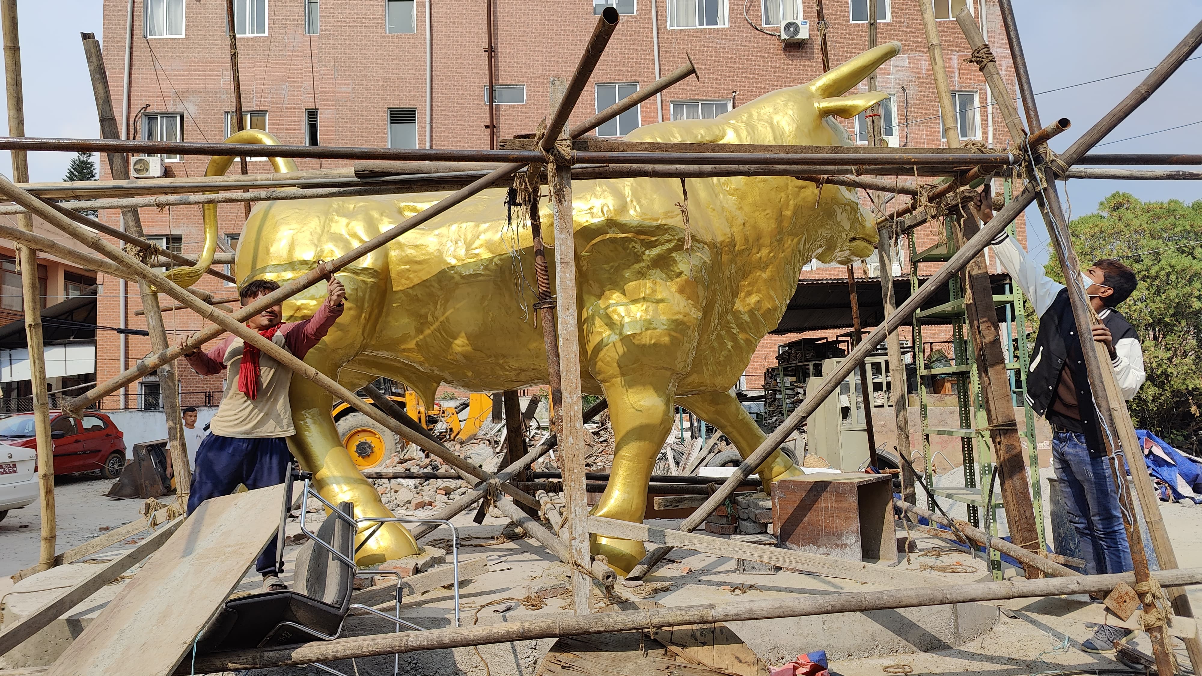काठमाडौं । नेपाल स्टक एक्सचेन्ज नेप्सेको प्राङ्गणमा साँढेको प्रतिमा निर्माण अन्तिम चरणमा पुगेको छ । दुई बर्षअघि नै नेप्सेले वोलपत्र आब्हान गरी साँढेको प्रतिमा निर्माण गर्न गोप्य शिलबन्दी बोलपत्र प्रक्रिया अघि बढाएको थियो । नेप्सेले तयार पारेको स्केच अनुसारको साँढे प्रतिमा निर्माण भइरहेको हो । विश्वभर स्टक मार्केट अगाडी साँढे अर्थात् चार्जिंग बुलको प्रतिमा राख्ने प्रचलन अनुसार नेपालमा पनि यसलाई प्रयोगमा ल्याउन लागिएको नेपाल स्टक एक्सचेन्ज जनाएको छ । नेपालमा पहिलो पटक प्राङगणमा साँढेको प्रतिमा स्थापना भइरहेको हो । केही काम बाँकी रहेकाले उदघाटनको समय तालिका निर्धारण गरिएको छैन । ललितपुरको पाटनका कालीगढले निर्माण गरिरहेको प्रतिमाको उचाई ६ फिट र लम्बाई ८ फिट र तौल ६ टन रहने जनाइएको छ । प्रतिमा निर्माण सकिदा एक करोड ६८ लाख रुपैयाँ बढी रकम खर्च हुने नेप्सेका प्रवक्ता मुराहरी पराजुलीले जनाएका छन् । उनका अनुसार असोज महिनाभित्रै काम सकिने अनुमान गरिएपनि केही प्राविधिक कठिनाइका कारण प्रतिमा निर्माणमा बढी समय लागेको हो ।