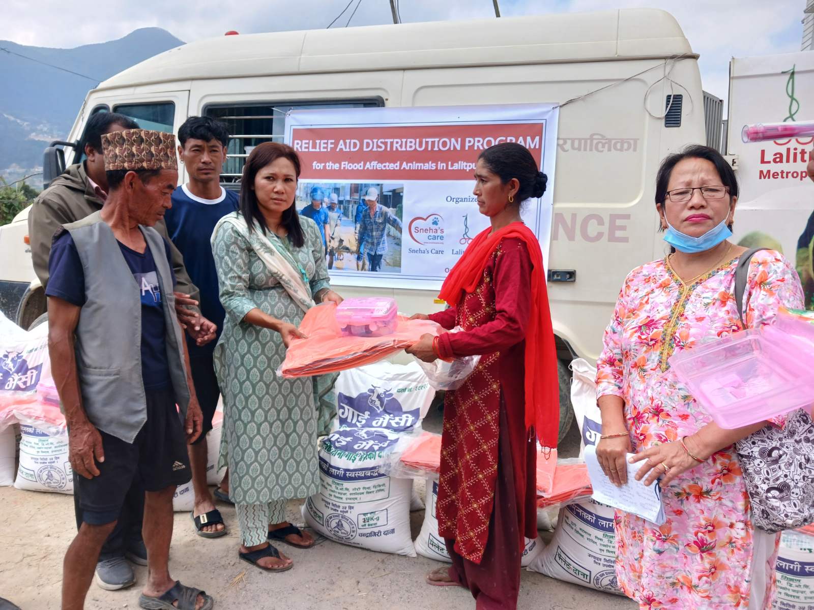 राहत वितरण गर्नु अघि बिरामी र घाइते चौपायाको उपचार गरिएको थियो । बगाएर ल्याएका चौपाया संकलन, तिनको व्यवस्थापन लगायतको काममा स्नेहाज केयरले सक्रिय रुपमा काम गरेको स्थानीयहरु बताउँछन् । कार्यक्रममा उपलब्ध गराइएको तथ्यांक अनुसार ललितपुर महानगरको वडा नंं. १८, २१, २२, २४, २५, २६, २७ र २९ गरी आठ वटा वडामा चौपायाको क्षति धेरै भएको छ ।