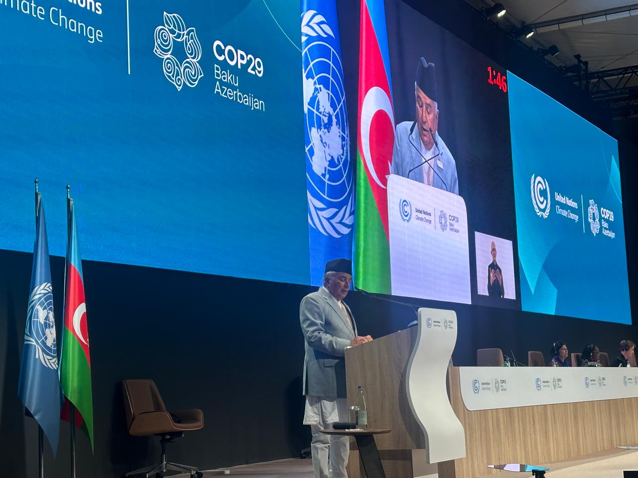 अजरबैजान (बाकु) । राष्ट्रपति रामचन्द्र पौडेलले हिमालको सुरक्षा भनेकै पृथ्वीको सुरक्षा हो भन्ने कुरा ख्याल गर्न विश्व समुदायलाई आह्वान गरेका छन् । अजरबैजानको बाकु सहरमा अस्तिदेखि (कात्तिक २६ गतेबाट) सुरु भएको जलवायु परिवर्तनसम्बन्धी संयुक्त राष्ट्र संघीय संरचना महासन्धि पक्ष राष्ट्रहरुको २९ औँ सम्मेलन (कोप–२९) मा विश्व नेताहरूको उच्च स्तरीय सत्रलाई मंगलबार यहाँ सम्बोधन गर्दै राष्ट्रपति पौडेलले भने, “ हिमालको सुरक्षा भनेकै पृथ्वीको सुरक्षा हो भन्ने कुरा सबैले ख्याल गरौं, पर्वतीय मुलुकका सेता हिमाल काला पहाडमा परिणत हुने क्रमले ती मुलुकमा मात्र होइन तल्लो तटीय मुलुकहरूलाई संकटमा पु¥याउँछ भन्ने विश्वले बिर्सन हुन्न ।” उनले यसका लागि हिमालदेखि समुद्रसम्मको एकिकृत र समष्टिगत अनुकुलन अवधारणालाई औपचारिक सम्वादको विषय बनाउन समेत सो सम्मेलनमा प्रस्ताव गरे। साथै, नेपालले यसै अवधारणामा आधारित भई सगरमाथा सम्वाद कार्यक्रम सञ्चालन गर्न लागेको उनले जानकारी दिए । राष्ट्रपति पौडेलले आफू जलवायु न्याय र क्षतिपूर्तिको आवाज लिएर यस सम्मेलनमा सहभागी हुन आएको बताउँदै भने, “ गोलाबारुदमा खर्च भइरहेको ठूलो स्रोतसाधन जलवायु परिवर्तनका नकारात्मक असर न्यूनीरकण गर्दै मानव सभ्यताको बचाउमा उपयोग हुनुपर्दछ ।” जलवायु परिर्वतनको मारबाट पृथ्वीनै संकटमा रहेको उनले बर्ताए । विशेषगरी गरिव, अल्पविकसित, विकासशील तथा साना टापु मुलुकहरू यसको पीडाबाट बढी प्रभावित रहेको उनको भनाइ थियो । “नगन्य कार्बन उत्सर्जन गर्ने तर व्यापक नकारात्मक असर भोग्नुपर्ने विरोधाभासपूर्ण अवस्थाबाट नेपाल गुज्रिरहेको छ”, राष्ट्रपति पौडेलले भने । उनले नेपाल अहिले पनि जलवायुजन्य प्रकोपको आलो पीडामा रहेको बताए। हालैको बाढी पहिरो तथा हिमताल विष्फोटन लगायतका विपद्बाट सयौं मानिसको मृत्यु र अरबौंको भौतिक क्षति भएको र त्यसको पुनर्लाभ र पुनस्र्थापना अझ भइनसकेको राष्ट्रपति पौडेलले जानकारी दिए । “विश्व समुदायको हित र पृथ्वीको रक्षाको लागि नेपालले प्राकृतिक स्रोतसाधनको उपयोगमा अनुशासन कायम राख्दै कार्बन उत्सर्जन न्यूनीकरणको महत्वाकांक्षी एनडीसी योजना कार्यान्वयन गरिरहेका छौं, वन क्षेत्र बढाएका छौं, स्वच्छ उर्जा उत्पादन र आपूर्तिमा जोड दिएका छौं तथा अरु थुप्रै प्रयासहरु भएका छन्”, राष्ट्रपति पौडेलले भने । उनले हाम्रा प्रयासका तुलनामा जलवायु परिवर्तनको असर व्यापक रहेकोले हाम्रा सामु धेरै चुनौतीहरु छन जसको सामाना गर्न हाम्रो क्षमताले पुग्दैन भने । “जलवायु अनुकुलन र उत्सर्जन न्युनिकरणका लागि हामीले गरिबी निवारणमा छुट्याएको बजेट कटौती गर्नुपरेको छ, यसबाट हामीहरु झन अन्यायमा परे