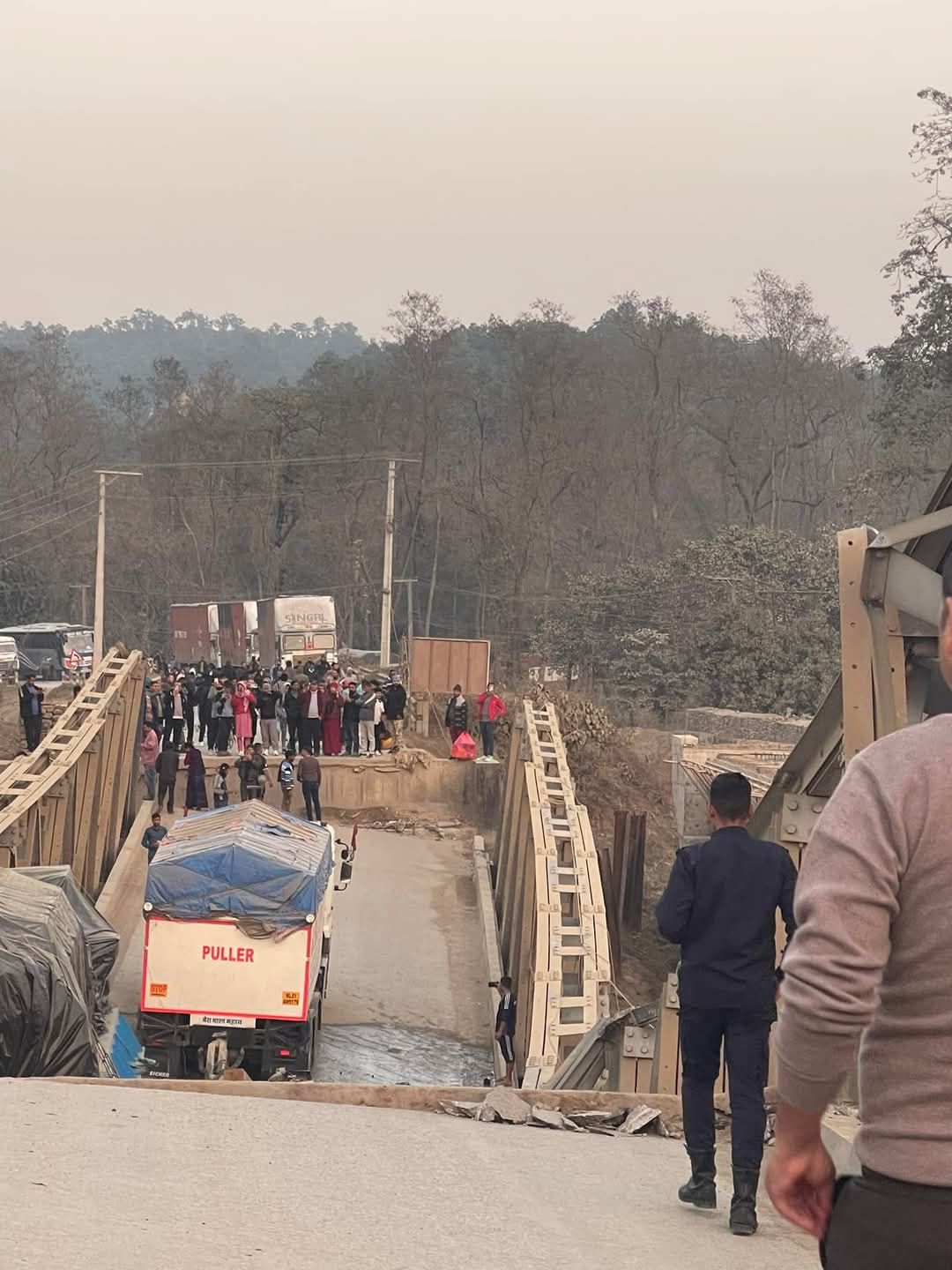काठमाडौं । ६० टनभन्दा धेरै गह्रुँगो सामान बोकेर आएको गाडीका कारण पुल भाँचिएपछि दुम्कीबासस्थित विनयी खोलामा वैकल्पिक सडक निर्माण गरेर यातायात संचालन गरिएको छ । कपिलवस्तुस्थित कृष्णनगर भन्सार कार्यालयबाट नेपाल भित्रिएको ६० टनभन्दा गह्रुँगो सामान बोकेको ट्रकका कारण विनयी खोलाको पुल शुक्रबार साँझ भाँच्चिएको थियो । ७४ चक्के भारतीय मालवहाक लरीले हेटौंडास्थित शिवओम सिमेन्ट उद्योगको सामान ल्याउँदै गर्दा पुल भाँचिएको हो । यसले बोकेको सामान ६० टनभन्दा धैरै गह्रुँगो थियो । अत्यधिक भार बोकेको मालबहाक ट्रक दाउन्ने पहाडको उकालो चढ्न नसकेपछि शुक्रबार दिउँसो दुई वटा डोजरले धकेलेर ल्याइएको थियो । पुलदेखि ४ सय मिटर पश्चिममा रहेको दुम्कीबास बजारबाट उत्तर सिजी सिमेन्टडाँडा चौर भएर होंसी सिमेन्ट चोकमा निस्कने गरफ डाइभर्सन सडक निर्माण गरेर शुक्रबार राति साढे ८ बजेबाट गाडी सञ्चालनमा ल्याइएको छ । राजमार्गमा रोकिएका सबै गाडी वैकल्पिक मार्गबाट पठाइएको जिल्ला प्रहरीका सूचना अधिकारी डीएसपी जेसी शाहले जानकारी दिए । यो वैकल्पिक सडक करिब ७ किलोमिटर घुमाउरो छ ।
