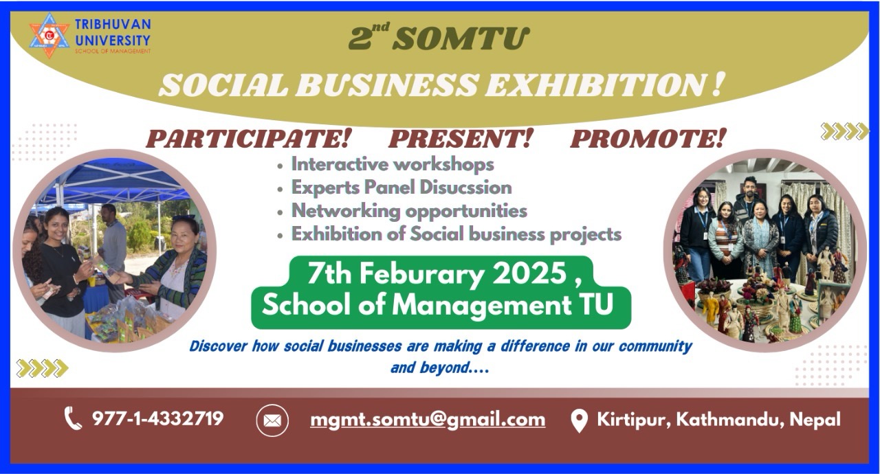 काठमाडौं । त्रिभुवन विश्वविद्यालय, स्कूल अफ म्यानेजमेन्ट (सोम) टि. यु. को आयोजनामा दोस्रो सोम. टि. यु सामाजिक व्यवसाय प्रदर्शनी २०२५ यही माघ २५ गते (फेब्रुअरी ७, २०२५) शुक्रबार कीर्तिपुर स्थित स्कूल अफ म्यानेजमेन्ट (सोम. टि. यु ). क्याम्पसमा आयोजना हुँदैछ । । ‘दिगोपनको यात्रा नारासहित आयोजना गरिने यस कार्यक्रमले सामाजिक व्यवसाय प्रवर्द्धन, उद्यमशीलता र दिगो व्यापारको सम्भावनालाई उजागर गर्नेउद्देश्य राखेको छ।प्रदर्शनीमा २५ भन्दा बढी स्टलहरू रहने छन् । जसमा हस्तकला, वातावरणमैत्री उत्पादन, जैविक कृषि, पुनर्चक्रण, नवप्रवर्तनमूलक प्रविधि, सूचनाप्रविधि, तथा सामाजिक व्यवसाय प्रवर्द्धन गर्ने विभिन्न उद्यमहरू समेटिने छन् । यस व्यवसाय प्रदर्शनीमा व्यवसायी, नवउद्यमी, विद्यार्थी, स्थानीय समुदायका प्रतिनिधिहरू, मिडियाकर्मी तथा सामाजिक प्रभावशाली व्यक्तित्वहरू सहभागी हुनेछन् । साथै, कार्यशाला, प्यानल छलफल, नेटवर्किङ, व्यवसाय प्रवर्द्धन तथा नवीनतम सामाजिक व्यवसाय अवधारणाहरूमा छलफल गरिने छ । सहभागी व्यवसायहरूमा रिकृति, कास्याज्वेलरी, फूलप्रसाद, क्रोशेक्रियशन्स, सिस्टर्स क्रिएशन, आनुग्रह हस्तकला, समाह ज्वेलरी, भांग्रो, दीगो नेपाल, विन्टर ग्रीनटी, लछी, भूमिथान, मानुषी नेपाललगायतका स्थानीय उद्यमीहरू रहनेछन् । यस प्रदर्शनीको मुख्य आयोजक स्कूल अफ म्यानेजमेन्ट (सोम. टि. यु) का एम बिए २३औं ब्याचका विद्यार्थीहरू हुन् । आयोजकका अनुसार यो कार्यक्रम स्थानीय स्तरका दिगोव्यवसायलाई प्रवर्द्धन गर्ने र उद्यमशीलता विकास गर्ने उत्कृष्ट मञ्च हुनेछ ।सहभागिताका लागि सबैलाई खुला निमन्त्रणा दिइएको छ । यस व्यवसाय प्रदर्शनीमा सहभागी हुन इच्छुक जोसुकैले माघ २५ गते बिहान १० बजेपछि SOMTU क्याम्पस, कीर्तिपुरमा उपस्थित हुन सक्ने छन् ।
