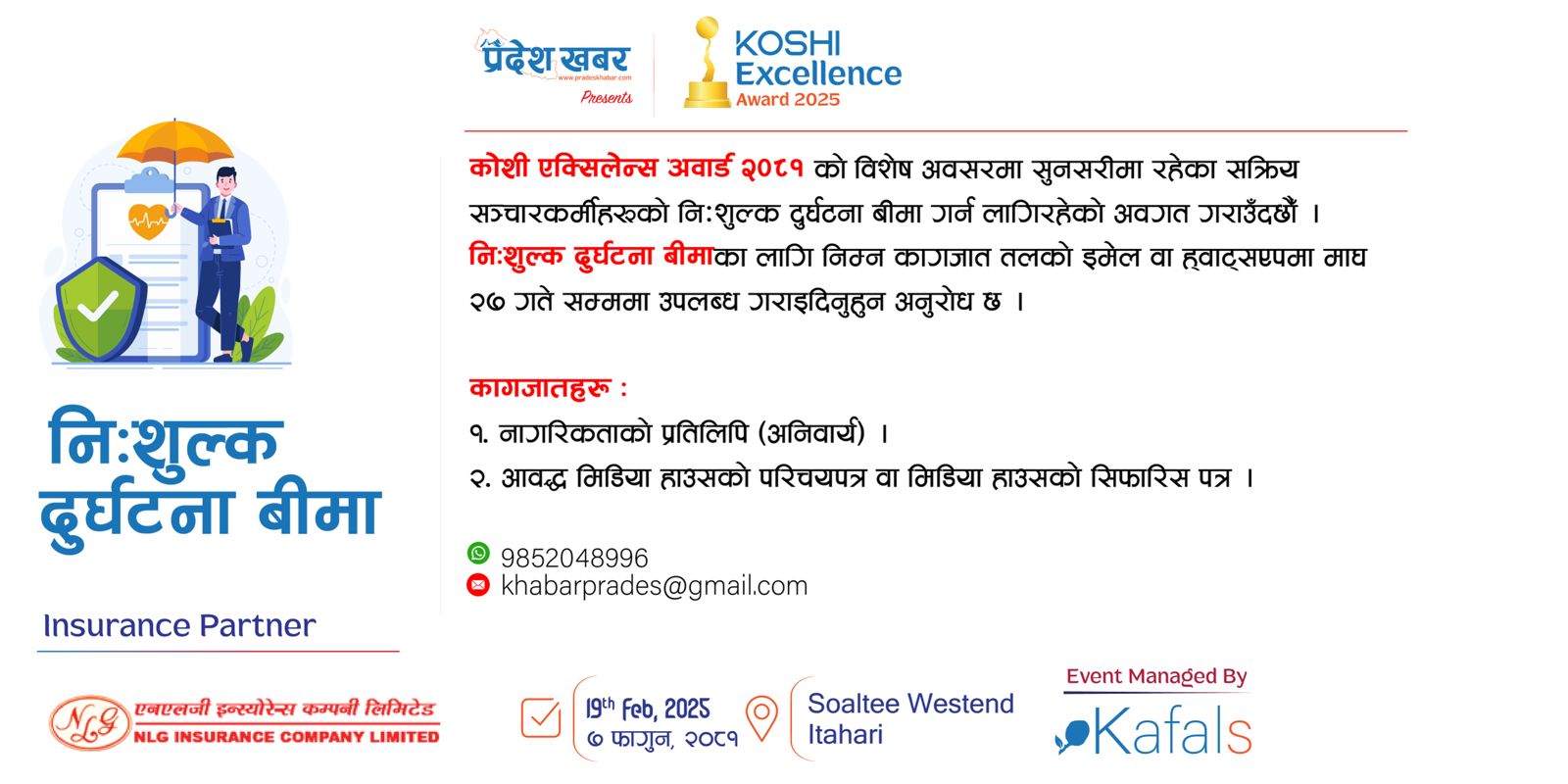 इटहरी । इटहरीबाट सञ्चालित डिजिटल पत्रिका प्रदेश खबर डटकम अनलाइनले आफ्नो स्थापनाको दुई वर्ष पूरा गरी तीन वर्षमा प्रवेश गरेको अवसरमा सुनसरीमा सक्रिय सञ्चारकर्मीहरूको निःशुल्क दुर्घटना बीमा गर्ने भएको छ । बुधबार एक सूचना जारी गर्दै नयन एड्भरटाइजिङ प्रालिद्वारा सञ्चालित पत्रिकाले आफ्नो वार्षिकोत्सवको अवसर पारेर सञ्चारकर्मीहरूको सुरक्षा र हौसला अभिवृद्धि गर्ने उद्देश्यले निःशुल्क दुर्घटना बीमा गर्ने निर्णय गरेको जानकारी दिएको हो । नयन एड्भरटाइजिङ मिडिया प्रालिका अध्यक्ष पवन अधिकारीका अनुसार उक्त बीमा योजनाका लागि इच्छुक सञ्चारकर्मीहरूले अनिवार्य रूपमा नागरिकताको प्रतिलिपि, आबद्ध मिडिया हाउसको परिचयपत्र वा मिडिया हाउसको सिफारिस पत्र इमेल वा ह्वाट्सएपमार्फत पठाउनुपर्नेछ । जसका लागि प्रदेश खबरको आधिकारिक इमेल khabarprades@gmail.com मा कागजात उपलब्ध गराउन सकिने उनले जनाए । यसै अवसरमा प्रदेश खबर डट कमले फागुन ७ गते ‘कोशी एक्सिलेन्स अवार्ड २०८१’ कार्यक्रम आयोजना गर्ने तयारी गरिरहेको छ। सो अवसरमा विभिन्न क्षेत्रका उत्कृष्ट व्यक्तित्वहरूलाई सम्मान गरिने बताइएको छ।