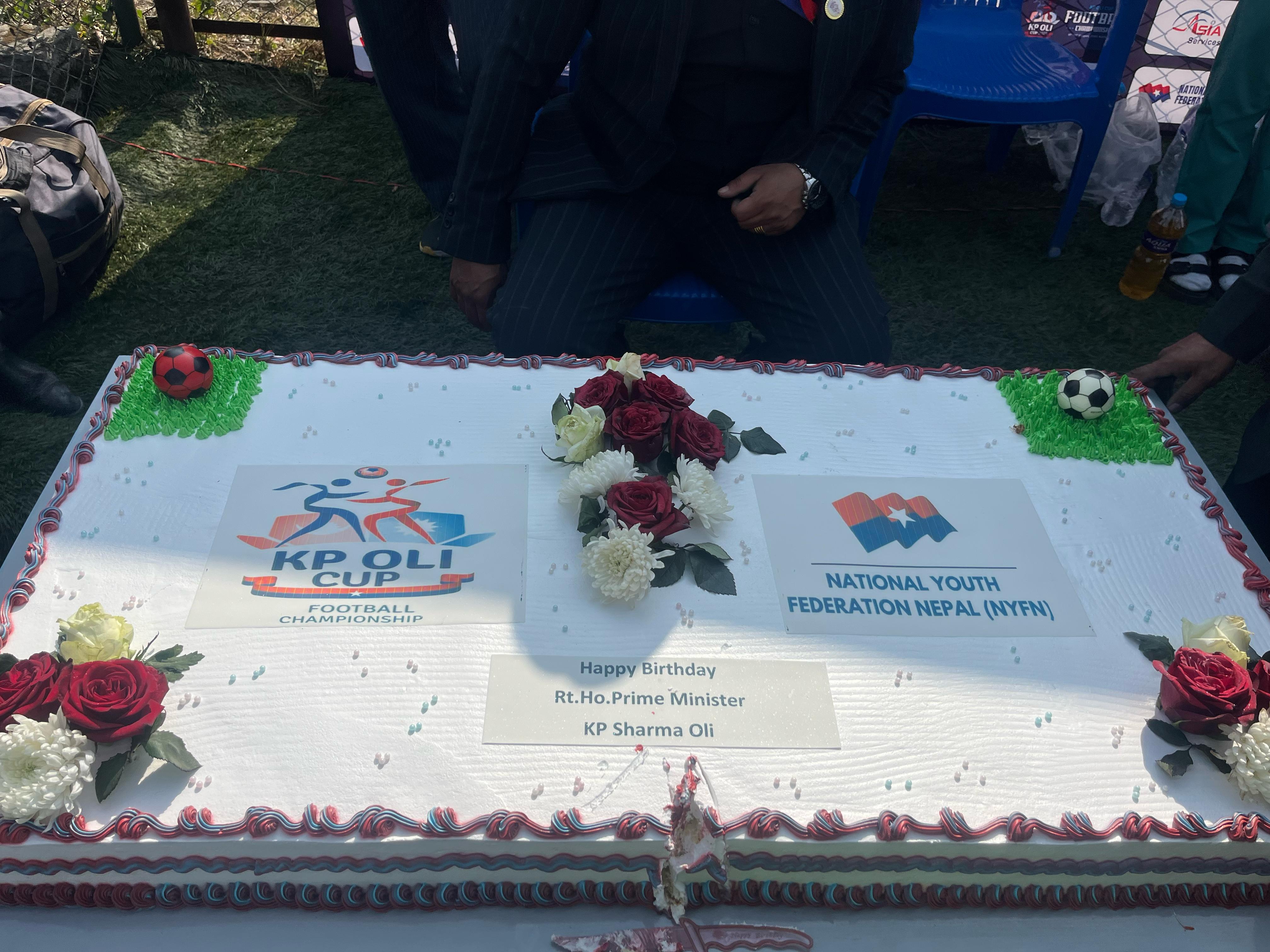 काठमाडौं । केपी ओली कप च्याम्पियनसिप फुटबल प्रतियोगिता सुरू भएको छ । आइतबार प्रधानमन्त्री ओलीको ७४औं जन्मदिनको अवसर पारेर प्रतियोगिताको उद्घाटन गरिएको हो । समारोहमा पचास पाउन्डको केक काटिएको थियो । प्रधानमन्त्री ओलीकी पत्नी राधिका शाक्यले केक खुवाएर ओलीलाई शुभकामना दिइन् । उद्घाटन समारोहमा वरिष्ठ हास्य कलाकार हरिवंश आचार्य, गायक महेश काफ्ले, गायिका अस्मिता अधिकारी, समीक्षा अधिकारी लगायतका कलाकारको समेत उपस्थित रहेको छ ।