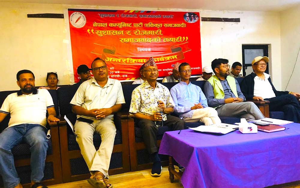 बुटवल । नेकपा (एकीकृत समाजवादी), लुम्बिनी प्रदेश कमिटीको आयोजनामा 'सुशासन र रोजगारी, समाजवादको तयारी' विषय अन्तरक्रिया कार्यक्रम सम्पन्न भएको छ । लुम्बिनी प्रदेश कमिटीले पार्टी केन्द्रले घोषणा गरेको दोस्रो चरणको आन्दोलनको कार्यक्रमअनुसार सुसासन र रोजगारी समाजवादको तयारी भन्ने नाराका साथ जारी आन्दोलनको महत्वका सम्बन्धमा अन्तरक्रिया कार्यक्रम गरेर जानकारी दिएको हो । प्रदेश कमिटीका अध्यक्ष अब्दुल हसेन खाँको अध्यक्षता तथा प्रदेश ईन्चार्ज, पार्टीका उपमहासचिव मेटमणी चौधरीको प्रमुख आतिथ्यतामा दाङको धोराहीमा उक्त कार्यक्रम सम्पन्न भएको हो । माग र आन्दोलनको महत्वका बारेमा अध्यक्ष अब्दुल हुसेन खाँले विषय प्रस्तुत गरेका थिए । प्रस्तुत विषयमाथि इन्चार्ज चौधरी, केन्द्रीय सदस्य अनारकली मियाँ, नेपाली कांग्रेसका नेता खगराज पाण्डे, माओवादी केन्द्रका नेता विश्व आचार्य, जनमोर्चा नेपालका नेता गणेश आचार्य, उधोगी व्यावसायी नारायण भुसाल, कानुन ब्यावसायी ओम भक्त डाँगी, शिक्षक महासंघका नेता युवराज पौडेलले मन्तव्य राखेका थिए । उपस्थितिका तर्फबाट सुझावमा राख्नेमा भुप बहादुर केसी, मुकुन्द बहकरी, प्रदिप के.सी, जंगबहादुर बिक, थानेश्वर खरेल थिए । प्रदेश कमिटी सचिव नारायण शर्माले सञ्चालन गरेको कार्यक्रममा अहमद अब्दुल रउफ, सुनिता बि.एम., सस्मति चौधरी, वीर बहादुर केसी लगायतका नेताहरु अतिथिका रुपमा उपस्थित थिए ।