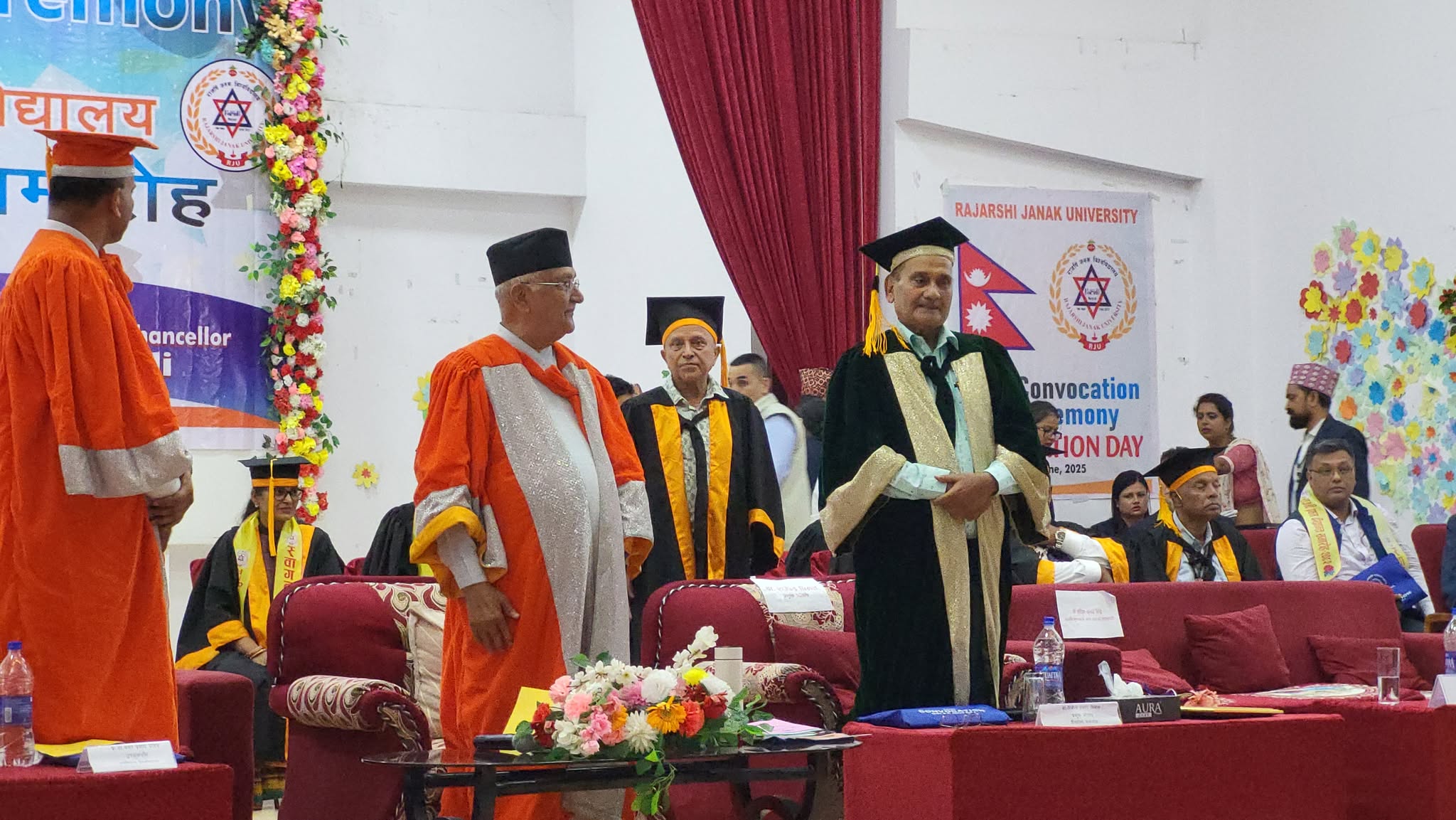 जनकपुर । राजर्षि जनक विश्वविद्यालयको पहिलो दिक्षान्त समारोहमा ८६ विद्यार्थी दीक्षित भएका छन् । मंगलबार जनकपुरधाममा भएको दीक्षान्त समारोहमा प्रधानमन्त्री एवम् विश्वविद्यालयका कुलपति केपी शर्मा ओलीले स्नातक तथा स्नातकोत्तर तह उत्तीर्ण ८६ विद्यार्थीलाई दीक्षित गरेका हुन् । स्नातक तथा स्नातकोत्तर तह उत्तीर्ण १ सय १४ विद्यार्थीमध्ये ८६ जनाले दीक्षान्त समारोहमा सहभागी हुनेगरी आवेदन दिएका थिए । त्यस्तै, विश्वविद्यालय टपर चार जना, विभिन्न संकाय तथा शैक्षिक कार्यक्रममा उत्कृष्ट हुने १०–१० विद्यार्थी गोल्ड मेडलबाट विभूषित भएका छन् । त्यस्तै कार्यक्रममा बोल्दै प्रधानमन्त्री केपी शर्मा ओलीले जनकपुरधाममा राजर्षि जनक विश्वविद्यालयको पहिलो दिक्षान्त समारोहमा शासकीय कुव्यवस्थालाई दोषी ठहर गर्दै विश्वविद्यालयको स्थापना र विद्यार्थीहरूको दिक्षान्तमा खुशी व्यक्त गरे । उनले जनकपुरधामलाई ज्ञानको भूमि रहेको र चार हजार वर्षअघि यहाँ विद्वताको छलफल भएको ठाउँमा आज फेरी विश्वविद्यालय स्थापना भएकोमा खुशी व्यक्त गरे । उनले शिक्षा प्रणालीको प्राचिनता र पूर्वीय दर्शनको महत्वमा जोड दिदै शिक्षा क्षेत्रमा भएका कमजोरीलाई हटाउने प्रतिवद्धता जनाए । प्रधानमन्त्री ओलीले विश्वविद्यालयका विद्यार्थीलाई प्रेरित गर्दै भने, ‘सफलताका लागि यो शुरुआत महत्त्वपूर्ण छ, ठूलो यात्रा सधैं पहिलो पाइलाबाट सुरु हुन्छ ।’