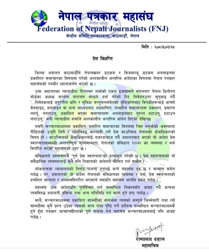 काठमाडौं । नेपाल पत्रकार महासंघले जिल्ला अदालत काठमाडौंको आदेश प्रति आपत्ति जनाएको छ । नेपालखबर डटकम र बिजमान्डु डटकम अनलाइनमा प्रकाशित समाचारलाई हटाउन सो अदालतले दिएको आदेश प्रेस स्वतन्त्रता र संविधानको मर्मविपरीत भएकोसमेत जनाएको छ । अदालतले समाचार हटाउन दिएको अल्पकालीन अन्तरिम आदेशप्रति महासंघको गम्भीर ध्यानाकर्षण भएको महासचिव रामप्रसाद दाहालले जारी गरेको विज्ञप्तिमा उल्लेख छ । न्यायाधीश पीताम्बर शर्माको एकल इजलासले गत मंगलबार नेपाल धितोपत्र बोर्डका अध्यक्ष सन्तोषनारायण श्रेष्ठले दर्ता गरेको रिट निवेदन उपर सुनुवाइ गर्दै दिएको आदेशमा महासंघले संविधानविपरीत भएकोसमेत उल्लेख गर्दै महासंघले सञ्चारमाध्यममा प्रकाशित–प्रसारित समाचारका विषयमा चित्त नबुझेमा पीडितको उजुरी लिने र त्यसविरुद्ध कारबाही गर्ने प्रेस काउन्सिल नेपालको क्षेत्राधिकार भएको उल्लेख गर्दै अदालतले क्षेत्राधिकारलाई नजरअन्दाज गर्दै आदेश गरेको महासंघको आरोप छ। महासंघले अदालतलाई उक्त आदेशबारे पुनर्विचार गर्न आग्रह पनि गरेको छ ।