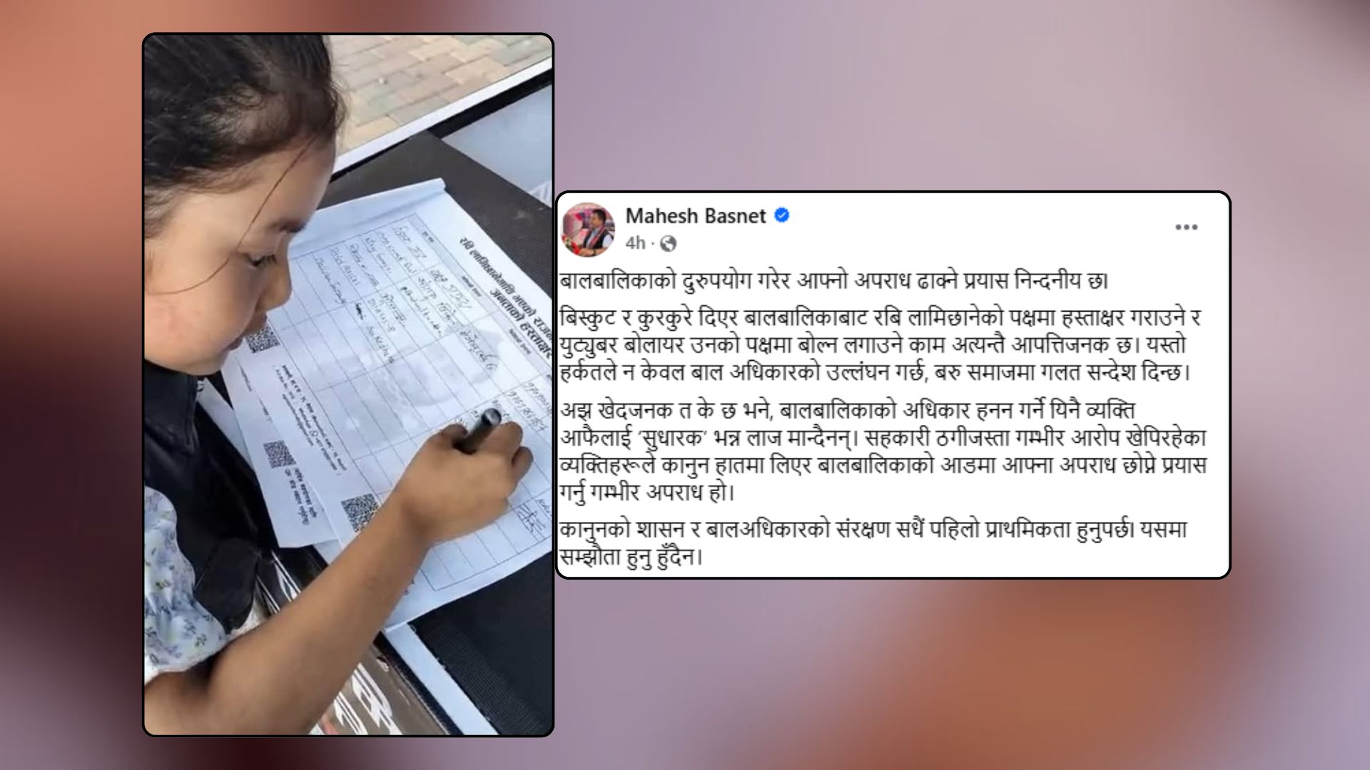 काठमाडौं । नेकपा एमालेका नेता तथा पूर्वमन्त्री महेश बस्नेतले रास्वपा सभापति रवि लामिछानेको पक्षमा भइरहेको हस्ताक्षर अभियानले अपराध ढाक्ने काम भएको भन्दै विरोध गरेका छन् । शनिबार उनले आफ्नो सामाजिक सञ्जालमार्फत बालबालिकाको दुरुपयोग गरेर आफ्नो अपराध ढाक्ने प्रयास निन्दनीय रहेको बताएका छन् । उनले सामाजिक सन्जालमा लेख्दै भनेका छन्,’बिस्कुट र कुरकुरे दिएर बालबालिकाबाट रवि लामिछानेको पक्षमा हस्ताक्षर गराउने र युट्युबर बोलाएर उनको पक्षमा बोल्न लगाउने काम अत्यन्तै आपत्तिजनक छ । यस्तो हर्कतले केवल बाल अधिकारको उल्लङ्घन गर्छ, समाजमा गलत सन्देश दिन्छ ।’ ‘अझ खेदजनक त के छ भने, बालबालिकाको अधिकार हनन गर्ने यिनै व्यक्ति आफैलाई ‘सुधारक’ भन्न लाज मान्दैनन् । सहकारी ठगीजस्ता गम्भीर आरोप खेपिरहेका व्यक्तिहरूले कानुन हातमा लिएर बालबालिकाको आडमा आफ्ना अपराध छोप्ने प्रयास गर्नु गम्भीर अपराध हो,’ उनले थप भने । कानुनको शासन र बालअधिकारको संरक्षण सधैँ पहिलो प्राथमिकतामा रहनुपर्ने भन्दै उनले यसमा सम्झौता हुन नहुने उल्लेख गरेका छन् ।