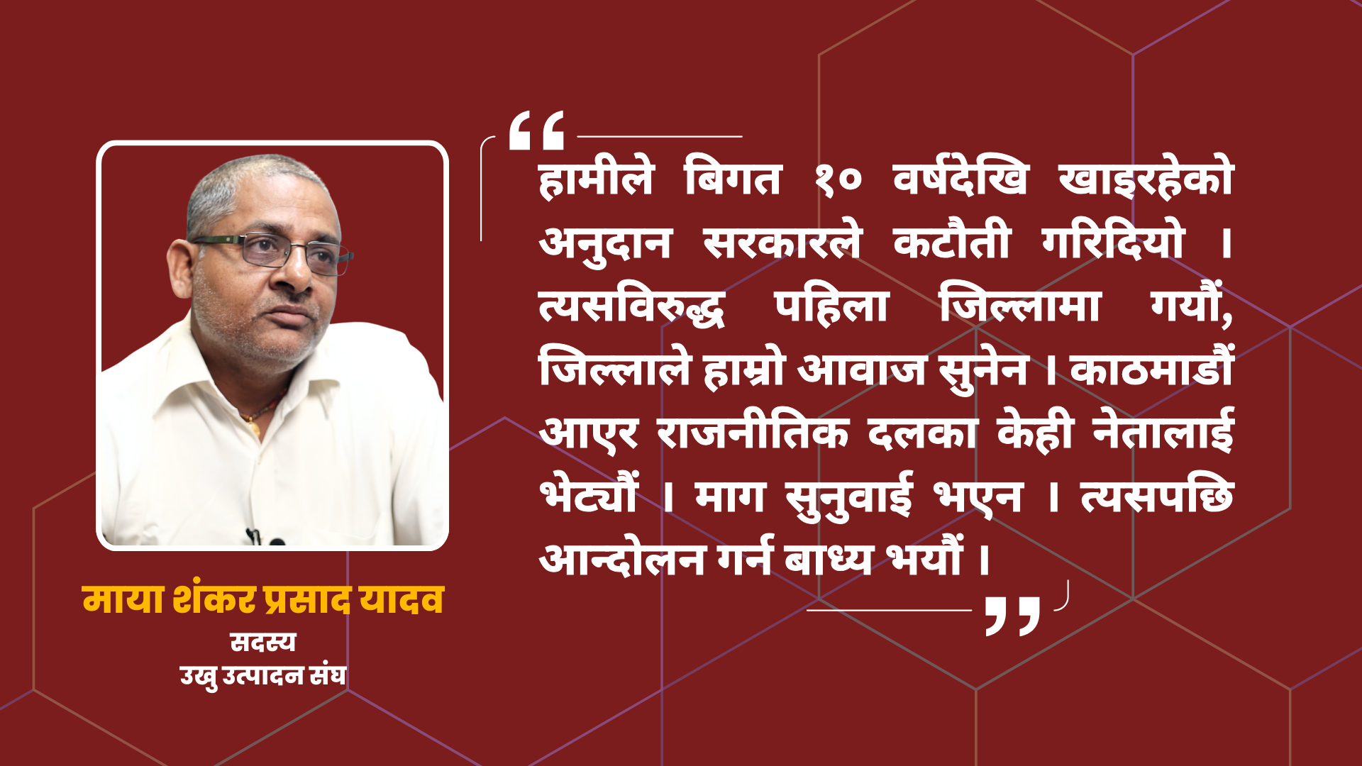 हामीले बिगत १० वर्षदेखि खाइरहेको अनुदान सरकारले कटौती गरिदियो । त्यसविरुद्ध पहिला जिल्लामा गयौं, जिल्लाले हाम्रो आवाज सुनेन । काठमाडौं आएर राजनीतिक दलका केही नेतालाई भेट्यौं । माग सुनुवाई भएन । त्यसपछि आन्दोलन गर्न बाध्य भयौं । माया शंकर प्रसाद यादव सदस्य उखु उत्पादन संघ