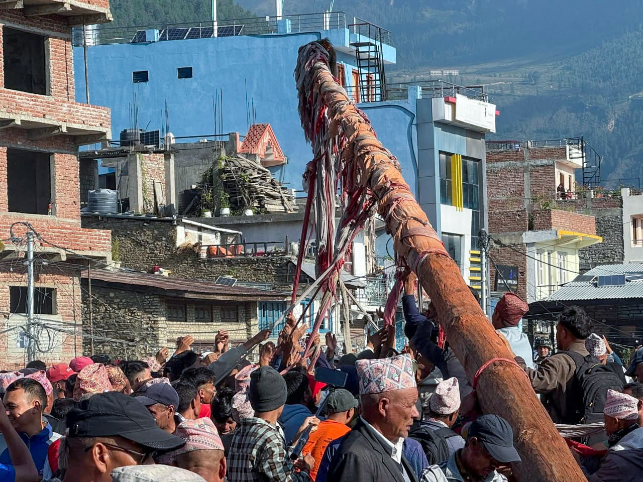 मुगु । जुम्ला सदरमुकाम खलङ्गा बजारमा रहेको कर्णाली प्रदेशको प्रसिद्ध चन्दननाथ र भैरवनाथ मन्दिरको ५२ हातको नयाँ लिङ्गो फेरिएको छ । हरेक वर्ष घटस्थापनाका दिन लिङ्गो फेर्ने प्रचलनअनुसार यस वर्ष पनि लिङ्गो फेरिएको चन्दननाथ एवं भैरवनाथ मन्दिर गुठी व्यवस्थापन समितिका अध्यक्ष अमर थापाले बताए । मन्दिरमा लिङ्गो ठड्याइसकेपछि मात्रै जुम्लावासीले आ–आफ्ना घरमा घटस्थापना गर्दछन् । ‘चन्दननाथ मन्दिरमा ५२ हाते लिङ्गो र ५२ हाते ध्वजा राखिएको हुन्छ । भैरवनाथ मन्दिरको लिङ्गोमा ४८ हातको लिङ्गो र ४८ हातकै ध्वजा राख्ने चलन छ’, थापाले भने । उनका अनुसार वर्षमा ५२ हप्ता हुने भएकाले वर्षभरि चन्दननाथ र भैरवनाथले रक्षा गरुन् भनेर ५२ हाते लिङ्गोसहित ध्वजा राख्ने प्रचलन रहेको हो । मन्दिरको माटो लगेर यहाँका स्थानीयले घरमा जमरा राख्ने प्रचलन रहेको अध्यक्ष थापाले बताए । मन्दिरमा जय स्तम्भसहित पाँचवटा लिङ्गो खडा गरिएको उनको भनाइ छ । घटस्थापनाको दिन उत्पादन वृद्धि होस्, भोकमरी नहोस् भन्ने कामनासहित चन्दननाथ भैरवनाथ मन्दिरमा मार्सीधानको सिक चडाउने परम्परा रहेको यहाँको संस्कृतिका जानकार रमानन्द आर्चायले जानकारी दिए । एक दशक पहिलेसम्म लिङ्गो फेर्न तत्कालीन कर्णाली अञ्चलका जिल्लाबाट विभिन्न वस्तु पठाउने चलन थियो । ‘जुम्लाबाट अन्न र पैसा, कालिकोटबाट बाबियो, घीउ, मह आउथ्यो । हुम्लाबाट ठेटुवा, चौरी फुर्को र थाप्का आउथ्यो भने मुगुबाट मास, मुगी दाल, राडीपाखी, ठेटुवा र चौरी पठाइन्थ्यो’, उनले भने । अहिले उक्त परम्परा रोकिएको आचार्यले बताए । अहिले सुरक्षाकर्मीले सबै व्यवस्था गर्ने उनको भनाइ छ । कर्णाली प्रदेशद सरकारले यही असोज १४ गते (कृष्ण त्रयोदशी) मा चन्दननाथ मन्दिरको लिङ्गो बोक्ने दिनका रुपमा जुम्लामा एकदिन सार्वजनिक बिदा दिएको थियो ।