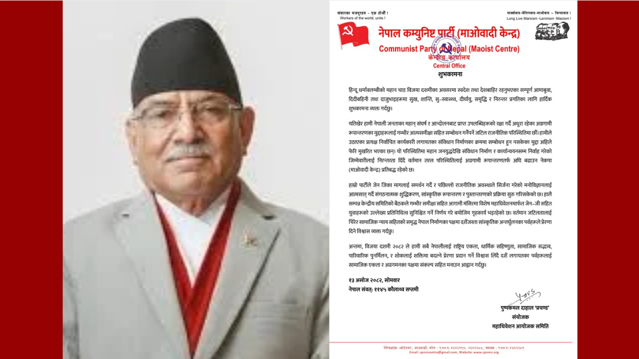 काठमाडौं । नेकपा माओवादी केन्द्रका अध्यक्ष पुष्पकमल दाहाल ‘प्रचण्ड’ ले विजया दशमीका अवसरमा स्वदेश तथा देशबाहिर रहेका सम्पूर्णमा शुभकामना व्यक्त गरेका छन् । सोमबार शुभकामना सन्देश दिँदै उनले दशैँको अवसरमा सबैलाई सुख, शान्ति, सु–स्वास्थ्य, दीर्घायु, समृद्धि र निरन्तर प्रगतिका लागि शुभकामना व्यक्त गरेका हुन् । यस्तै, उनले पार्टीले जेन जिका मागलाई समर्थन गर्दै र पछिल्लो राजनीतिक अवस्थाले सिर्जना गरेको मनोविज्ञानलाई आत्मसात् गर्दै संगठनात्मक शुद्धिकरण, सांस्कृतिक रूपान्तरण र पुस्तान्तरणको प्रक्रिया सुरु गरिसकेको पनि बताए । उनले भने, ‘हाम्रो पार्टीले जेन जिका मागलाई समर्थन गर्दै र पछिल्लो राजनीतिक अवस्थाले सिर्जना गरेको मनोविज्ञानलाई आत्मसात् गर्दै संगठनात्मक शुद्धिकरण, सांस्कृतिक रूपान्तरण र पुस्तान्तरणको प्रक्रिया सुरु गरिसकेको छ । हालै सम्पन्न केन्द्रीय समितिको बैठकले गम्भीर समीक्षा सहित आगामी मंसिरमा विशेष महाधिवेशनमार्फत जेन–जी सहित युवाहरूको उल्लेख्य प्रतिनिधित्व सुनिश्चित गर्ने निर्णय गरे बमोजिम गृहकार्य भइरहेको छ। वर्तमान जटिलतालाई चिरेर सामाजिक न्याय सहितको समृद्ध नेपाल निर्माणका पक्षमा दशैंजस्ता सांस्कृतिक अन्तर्घुलनका पर्वहरूले प्रेरणा दिने विश्वास व्यक्त गर्दछु ।’ उनले जनयुद्धदेखि संविधान निर्माण र कार्यान्वयनसम्म निर्वाह गरेको जिम्मेवारीलाई निरन्तरता दिँदै वर्तमान तरल परिस्थितिलाई अग्रगामी रूपान्तरणतर्फ अघि बढाउन नेकपा (माओवादी केन्द्र) प्रतिबद्ध रहेको समेत बताए । उनले भने, ‘यतिखेर हामी नेपाली जनताका महान् संघर्ष र आन्दोलनबाट प्राप्त उपलब्धिहरूको रक्षा गर्दै अधुरा रहेका अग्रगामी रूपान्तरणका मुद्दाहरूलाई गम्भीर आत्मसमीक्षा सहित सम्बोधन गर्नैपर्ने जटिल राजनीतिक परिस्थितिमा छौँ । हामीले उठाएका प्रत्यक्ष निर्वाचित कार्यकारी लगायतका संविधान निर्माणका क्रममा सम्बोधन हुन नसकेका मुद्दा अहिले फेरि मुखरित भएका छन् । यो परिस्थितिमा महान जनयुद्धदेखि संविधान निर्माण र कार्यान्वयनसम्म निर्वाह गरेको जिम्मेवारीलाई निरन्तरता दिँदै वर्तमान तरल परिस्थितिलाई अग्रगामी रूपान्तरणतर्फ अघि बढाउन नेकपा (माओवादी केन्द्र) प्रतिबद्ध रहेको छ ।’ सबै नेपालीलाई राष्ट्रिय एकता, धार्मिक सहिष्णुता, सामाजिक सद्भाव, पारिवारिक पुनर्मिलन र शोकलाई शक्तिमा बदल्ने प्रेरणा प्रदान गर्ने विश्वास लिँदै दशैं लगायतका पर्वहरूलाई सामाजिक एकता र अग्रगमनका पक्षमा संकल्प सहित मनाउन उनले आह्वान गरेका छन् ।