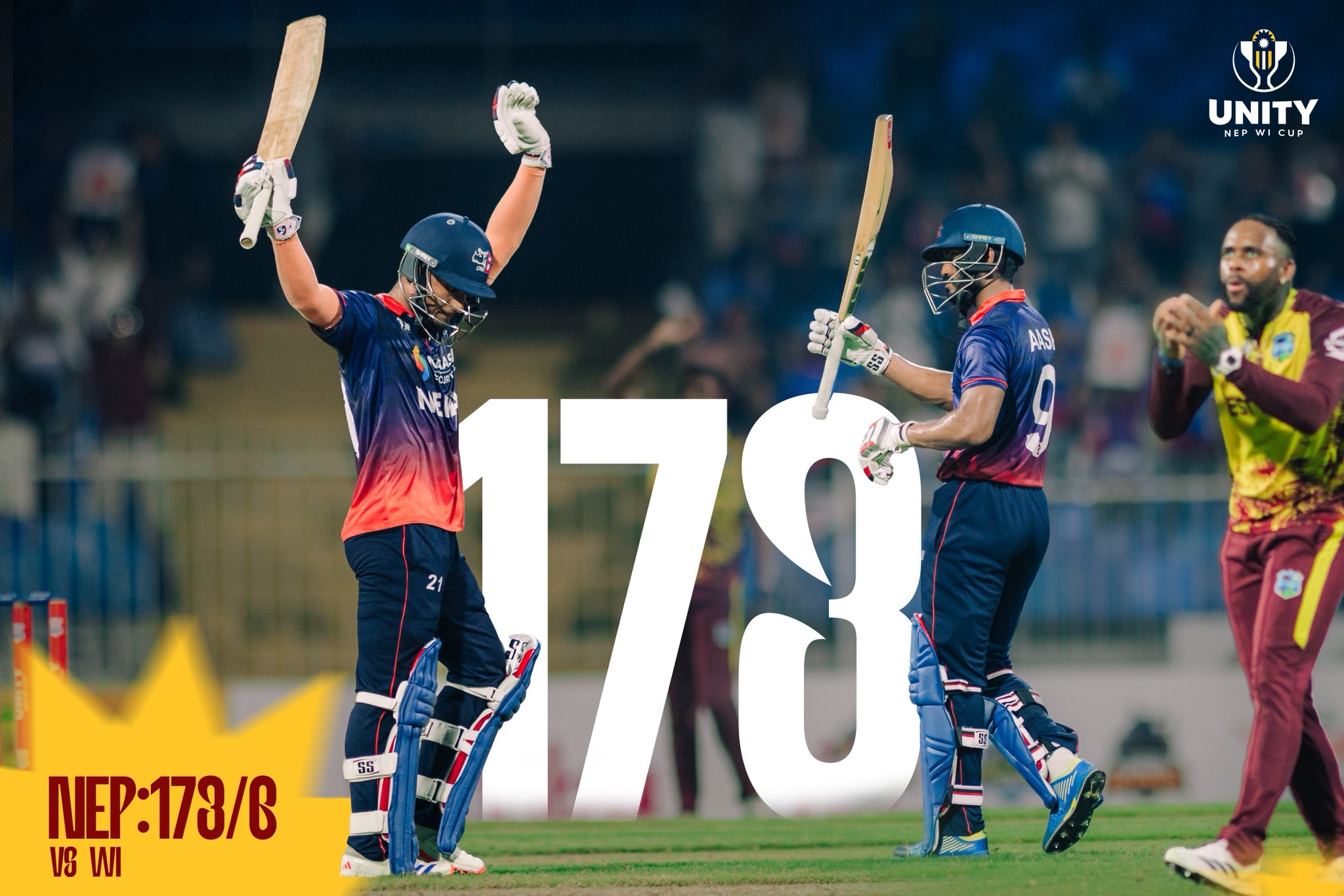 काठमाडौं । ओपनर आसिफ शेख र मध्यक्रमका ब्याटर सन्दीप जोराको कीर्तिमानी शतकीय साझेदारीमा नेपालले युनिटी कपको दोस्रो खेलमा वेष्टइण्डिजलाई १ सय ७४ रनको चुनौतीपूर्ण लक्ष्य दिएको छ । शारजाह क्रिकेट रंगशालामा टस जितेर पहिला ब्याटिङ रोजेको नेपालले निर्धारित २० ओभरमा ६ विकेट गुमाउँदै १ सय ७३ रन बनायो । नेपालका ओपनर आसिफ शेख ४७ बलमा ८ चौका र २ छक्कासहित ६८ रनमा नट आउट रहे । सन्दीप जोराले ३९ बलमा ३ चौका र ५ छक्कासहित ६३ रन बनाए । चौथो विकेटलाई सन्दीप र आसिफले १ सय रनको शतकीय साझेदारी गरेका थिए । नेपालको टी २० आईमा यो चौथो विकेटलाई भएको उच्च साझेदारी हो । यसअघि नेपालबाट २०२३ मा आसिफ र रोहितले युएईविरुद्ध टी २० आईमा चौथो विकेटलाई ९९ रनको साझेदारी गरेका थिए । त्यस्तै टेस्ट टोलीविरुद्ध टी २० आईमा पहिलो पटक नेपाली ब्याटरको अर्धशतक र शतकीय साझेदारी पनि हो । नेपालको सुरुवात दोस्रो खेलमा पनि राम्रो हुन सकेन । स्पिनर अकिल हुसेनले कुशल भुर्तेललाई दुई रनमा एलबीडब्लू आउट र कप्तान रोहित पौडेललाई तीन रनमा बोल्ड आउट गर्दै ३.३ ओभरमा १४/२ को अवस्थामा पुर्याएका थिए । त्यसपछि कुशल मल्ल ७ रनमा रन आउट भए । ननस्ट्राइकबाट रन लिन कुशल दौडिएपनि आसिफले पिचको केही भागमा आएर फर्किएपछि कुशल पुन ननस्ट्राइकमा फर्किनेक्रममा रन आउट भएका थिए । नेपाल ६.४ ओभरमा ४३/३ को अवस्थामा हुँदा क्रिजमा आएका सन्दीप जोराले आसिफ शेखसँग मिलेर राम्रो योगफल बनाएका थिए । आदिल अन्सारी ५ बलमा १ चौका र १ छक्कासहित ११ तथा गुल्शन झाले ६ रन बनाए । वेष्टइण्डिजका अकिल हुसेन र कायल मेयर्सले २ २ विकेट लिए । युनिटी कपको पहिलो खेलमा नेपालले वेष्टइण्डिजलाई १९ रनले हराएको थियो । नेपालले टेस्ट टोलीलाई आफ्नो इतिहासमा पहिलो पटक हराएको हो । नेपालले अव मंगलबार अन्तिम खेल खेल्नेछ ।