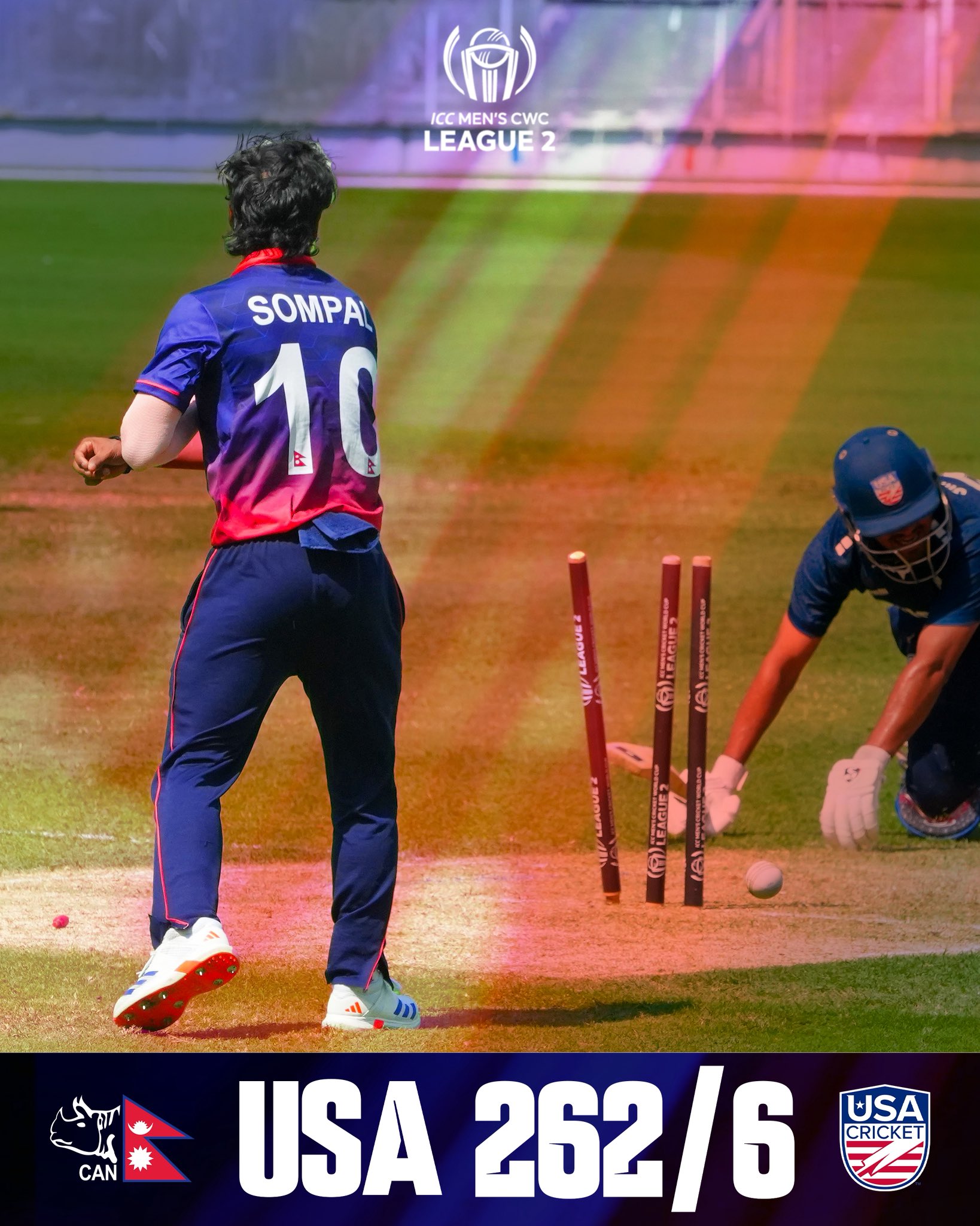 काठमाडौं । आइसिसी विश्वकप लिग–२ अन्तर्गत त्रिकोणात्मक सिरिजको पहिलो खेलमा अमेरिकाले नेपाललाई २ सय ६३ रनको चुनौती दिएको छ । दुबई अन्तराष्ट्रिय क्रिकेट स्टेडियममा टस जितेर नेपालले फिल्डिङ रोजेको थियो । पहिले ब्याटिङ गरेको अमेरिकाले ५० ओभरमा ६ विकेट गुमाउँदै २ सय ६२ रन बनायो । अमेरिकाले मध्यम सुरूवात गरेको हो । पहिलो पावर प्लेमा १ विकेटको नोक्सानीमा मात्र ३२ रन बनाएको थियो । सोमपाल कामीले अमेरिकाका ओपनर आन्द्रीएस गाउसलाई आउट गरे । ११ रन बनाएका गाउस भीम सार्कीद्वारा क्याच आउट भए । अमेरिकाले पहिलो विकेट गुमाउँदा १७ रन बनाएको थियो । आरिफ शेखले दोस्रो विकेट लिए । १० रन जोडेका अमेरिकाका कप्तान मोनांक पटेललाई एलबिडब्लु धरापमा पारे ।
