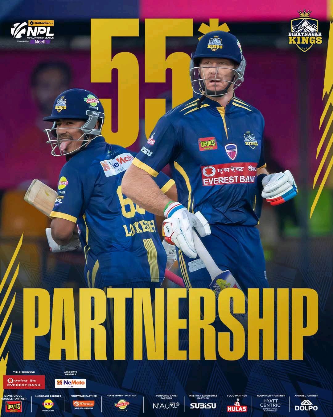काठमाडौं । दोस्रो नेपाल प्रिमियर लिग (एनपिएल) मा विराटनगर किंग्सले पोखरा एभेन्जर्सबीलाई २ सय २१ रनको कीर्तीमानी चुनौती दिएको छ । एनपिएलमा कुनै टोलीले बनाएको यो सर्वाधिक योगफल हो । विराटनगरको लागि लोकेश बम र मार्टिन गप्टिलले शतकीय साझेदारी गरे । पोखरले टस जितेर बलिङ गर्ने निर्णय गरेपछि विराटनगरले २० ओभरमा ६ विकेट गुमाउँदै एनपिएलकै सर्वाधिक २ सय २० रन बनाएको छ । यसअघि पहिलो संस्करणमा विराटनगरले लुम्बिनी विरुद्ध १ सय ९२ रन चेज गर्दै १ सय ९३ रन बानएको थियो । विराटनगरले दोस्रो ओभरको दोस्रो बलमा पहिलो विकेट गुमायो । जर्ज मुन्सेला १० रनमा म्याट टेलरकको बलमा आउट भए। यतिखेर विराटनगरले १४ रन मात्र बनाएको थियो । पहिलो पावर प्लेमा १ विकेट गुमाएर विराटनगरले ५५ रन बनायो । लोकेश बम र मार्टिन गपटिल क्रिजमा छाउँदा चौका र छक्काको वर्षात नै गरे । मार्टिनले २८ बलमा ३ चौका र ४ छक्का सहित अर्धशतक बनाए । १० ओभरको समाप्तिमा विराटनगर १ विकेटको नोक्सानीमा १ सय १ रन जोड्न सफल भए । यी दुई ब्याटरले पोखराका बलरहरूलाई निरिह नै बनाए । यो क्रममा लोकेश बमले ३७ औं बलमा छक्का प्रहार गर्दै अर्धशतक बनाए। यो क्रममा उनले ५ छक्का प्रहार गरे । लोकेश र मार्टिनले शतकीय साझेदारी गरे । १ सय ३२ रनको साझेदारी गरेर मार्टिन ६१ रनमा आउट भए । उनले ३५ बल खेल्दै ३ चौका र ५ छक्का प्रहार गरे । एनपिएलमा यो दोस्रो सर्वाधिक साझेदारी हो । यसअघि पहिलो संस्करणमा दिनेश खरेल र एन्ड्रेस गसले १ सय ७६ रनको साझेदारी गरेका थिए । लोकेश ७२ रनमा कुशल भुर्तेलको बलमा विपि खत्रीद्वारा क्याच आउट भए । उनले ४८ बल खेलेर १ चौका र ७ छक्का प्रहार गर्दै प्रभावशाली प्रदर्शन गरे । उनी आउट हुँदा विराटनगरले १५ ओभर ३ बलमा १ सय ५७ रन बनाएको थियो । शुभम रानजाने १६ बलमा ३ चौका र २ छक्का सहित ३८ रन जोडेर रन आउट भए। नारायण जोशी अविजित ११ रनमा रहे । बलिङमा म्याट टेलरले ४ ओभरमा ४८ रन दिएर २ विकेट लिए। सागर ढकाल र कुशलले १–१ विकेट लिए । यसअघि आज भएको खेलमा कर्णाली याक्सलाई ४ विकेटले हराउदै चितवनले विजयी सुरूवात गरेको छ। हिजो भएको पहिलो खेलमा भने काठमाडौंल जित निकालेको थियो ।