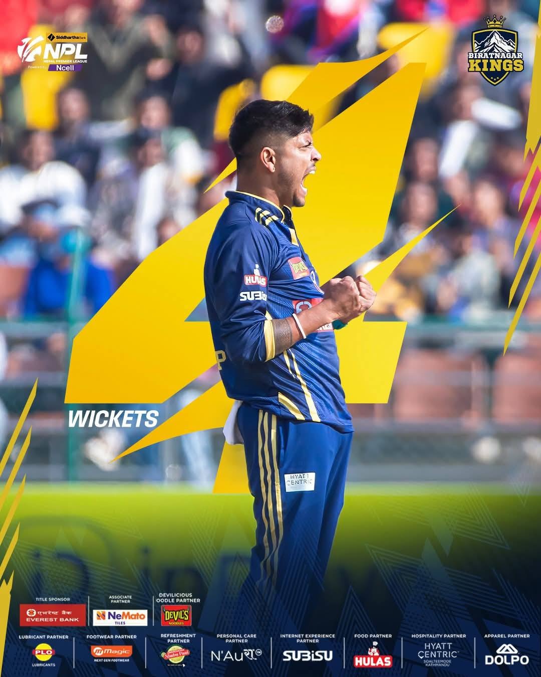 काठमाडौं । कप्तान सन्दीप लामिछानेको प्रभावशाली बलिङमा विराटनगर किंग्सले दोस्रो नेपाल प्रिमियर लिग (एनपिएल) मा लगातार तेस्रो जित हात पारेको छ । कम योगफलको रोमाञ्चक प्रतिस्पर्धामा विराटनगरले जनकपुरलाई ९ रनले हरायो । जितका साथ विराटनगर ६ अंकसहित तालिकाको शीर्षस्थानमा उक्लिएको छ । जितका लागि १ सय ३६ रनको लक्ष्य पछाएको जनकपुर २० ओभरमा ९ विकेट गुमाउँदै १ सय २६ रनमा समेटियो । सहज लक्ष्य पाए पनि जनकपुरले सुरुवात राम्रो गर्न सकेन । ओपनर आशिफ शेख १३ रनमा सूर्य तामाङको बलमा बोल्ड आउट भए । त्यतिखेर टिमले १९ रन बनाएको थियो । पहिलो पावर प्लेमा जनकपुर ३५ रनमा नै रोकियो । जुन विराटनगरले पावर प्लेमा बनाएको भन्दा ५ रनले कम हो । त्यसपछि सातौं ओभरको चौथो बलमा कप्तान अनिल शाह १४ बल खेलेर ४ रनमा सन्दीप लामिछानेको बलमा जर्ज मुन्सेद्वारा क्याच आउट हुन पुगे । ३५ रनमा दोस्रो विकेट गुमाएको जनकपुरले तेस्रो विकेट नवौं ओभरमा गुमायो । ओपनर लाहिरू मिलान्था २२ बल खेल्दै २ चौका र १ छक्का सहित २३ रन जोडेर सन्दीपको बलमा बोल्ड आउट भए । पहिलो क्रमका तीन ब्याटर गुमाउँदा जनकपुरले मात्र ४६ रन बनाएको थियो । १० ओभरको समाप्तिमा ६१ रन बनाएको जनकपुरलाई अन्तिम ६० बलमा जितको लागि ७५ रन जोड्नुपर्ने थियो । चौथो विकेटको रूपमा सञ्जय कृष्णमुर्ती आउट भए । १२ बलमा २ चौका र १ छक्कासहित २० रन जोडेका उनलाई सूर्यले पबिलियनको बाटो देखाइदिए । लगत्तै मयन यादव ४ रनमा आउट भए। ५ विकेटको नोक्सानीमा ७७ रन बनाएको जनकपुरलाई ३७ बलमा जितको लागि ५९ रन जरूरी थियो । खेल प्रतिस्पर्धात्मक बनेको थियो । त्यसपछि १५ औं ओभरमा ११ र १६ औं ओभरमा १४ रन जोड्दै जनकपुरले जितलाई सहज बनायो । तर १८ औं ओभरमा सन्दीपको ओभर निकै महत्वपूर्ण रहयो । उनले यो ओभरमा वाइडबाट १ रन दिएर २ विकेट लिए । रुपेश सिंहलाई ८ रनमा र संगिथलाई डक आउट गरे । त्यसपछि अन्तिम १२ बलमा जनकपुरलाई २३ रन जरुरी थियो । जहाँ मर्चेन्टले १ रन बनाएका आदित्य महतालाई एलबिडब्लु धरापमा पारे । यो सँगै ६ बलमा जनकपुरलाई १७ रन जोड्नु थियो । बलिङमा प्रतिश जिसी आए । दोस्रो बल वाइड थियो । यही बलमा जान निकोल लोफ्टी लोकेश बमद्वारा रन आउट भए । उनी ३० बलमा ४१ रन जोडेर आउट भए । तेस्रो बलमा ललित राजवंशीले चौका हाने । तर पनि यो ओभरमा ७ रन मात्र संभव हुँदा खेल बिराटनगरले जित्यो । सन्दीपले सानदार बलिङ गरे । ४ ओभरमा ११ रन दिएर ४ विकेट लिए । सूर्यले २ विकेट लिए । टियु क्रिकेट स्टेडियममा आज जनकपुरले टस जितेर बलिङ रोज्यो । विराटनगरले २० ओभरमा ७ विकेट गुुमाएर १ सय ३५ रन बनायो । जनकपुरले बलिङमा स्पिनरलाई जिम्मेवारी दियो । दुवै एन्डबाट स्पिनर प्रयोग गर्दा जनकपुरले पहिलो पावर प्लेमा विराटनगरलाई मात्र ४० रनमा 