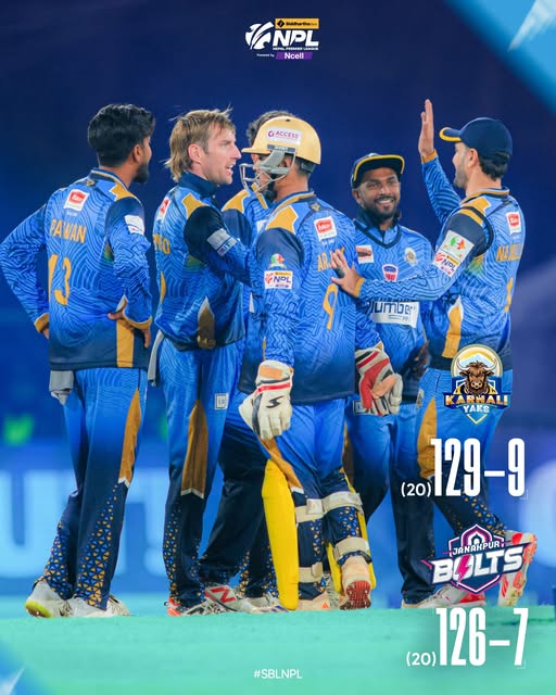 काठमाडौं । जारी नेपाल प्रिमियर लिग (एनपीएल) को दोस्रो सिजनको लिग चरणअन्तर्गत अन्तिम खेलमा कर्णाली याक्सले जनकपुर बोल्ट्सलाई हराएको छ । कीर्तिपुरस्थित त्रिवि क्रिकेट स्टेडियममा आइतबार भएको खेलमा कर्णालीले जनकपुरलाई ३ रनले हराएको हो । कर्णालीले दिएको १३० रनको लक्ष्य पछ्याएको जनकपुर पूरा ओभर खेल्दै ७ विकेट गुमाउँदै १२६ रनमा रोकियो । २९ रन जोड्दा ४ विकेट गुमाएको जनकपुरलाई संजय कृष्णमूर्तिले अर्धशतक पारी खेले । उनले ३९ बलमा १ चौका र ४ छक्कासहित ५१ रन जोडे । ओपनर माज सदाकतले १२ रन बनाउँदा अर्का ओपनर आसिफ शेख र अनिल साह डकआउट हुन पुगे । मयन यादवले ९ रन बनाउँदा जान निकोल लोफ्टी–इटनले रन जोडे । तर, अन्तिम ओभरमा १४ रन बनाउन नसक्दा जनकपुरले जित हासिल गर्न सकेन । कर्णालीका लागि विलियम बोसिस्टोले दुई विकेट लिँदा मार्क वाट, पवन सर्राफ र कप्तान सोमपाल कामीले एक–एक विकेट लिए । यसअघि टस हारेर ब्याटिङ थालेको कर्णालीले पूरै २० ओभर खेलेर ९ विकेटको क्षतिमा १२९ रन बनाएको थियो । कर्णालीका लागि ओपनर इमरान शेखले ३३ रन बनाउँदा गुल्शन झाको नाममा १९ रन रह्यो । अर्का ओपनर मार्क वाट ४ रनमै आउट हुँदा प्रियाङ्क पान्चालले १६ रन जोडे । विलियक बोसिस्टोले १५ रन बनाउँदा नजिबुल्लाह जद्रान १३ रनमा आउट भए । कप्तान सोमपाल कामीले १८ रन जोडे । जनकपुरका लागि ललित राजवंशी र आदित्य महताले दुई–दुई विकेट लिँदा अनिल साह, माज सदाकत र संगिथ कुरेले एक–एक विकेट लिए । यससँगै पहिलो सिजनको विजेता रहेको जनकपुरले अंक तालिकाको पुछारमा रहँदै सिजनको अन्त्य गरेको छ ।