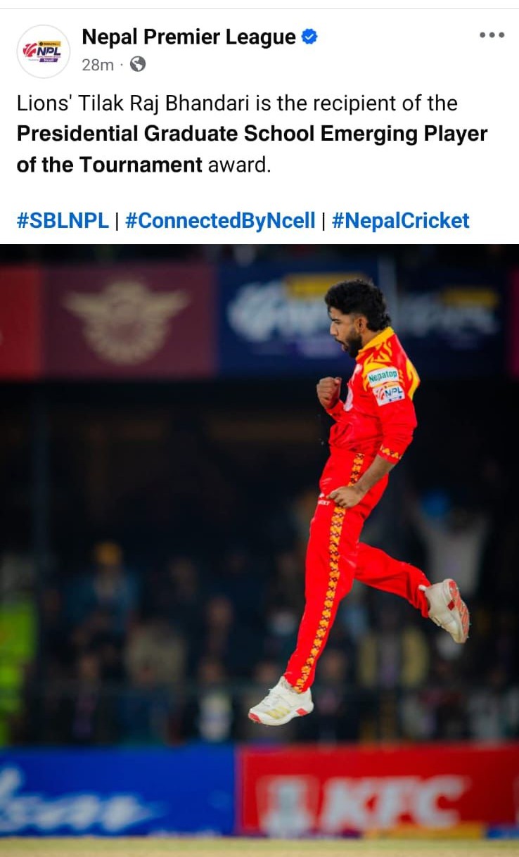 काठमाडौं । नेपाल प्रिमियर लिग (एनपीएल) मा ’प्रेसिडेन्सियल ग्रयाजुएट स्कुल इमर्जिङ प्लेरअर अफ दि टुर्नामेन्ट’ घोषित भएका तिलक राज भण्डारीलाई एनपीएल २०८२ को एजुकेशन पार्टनर प्रेसिडेन्सियल ग्राजुएट स्कुलले १५ लाख रुपैयाँ बराबरको स्कलरशिप प्रदान गरेको छ । अमेरिकाको वेस्टक्लिफ विश्वविद्यालयसँग सम्बन्धन प्राप्त थापागाउँ, बानेश्वरस्थित प्रेसिडेन्सियल ग्राजुएट स्कुलमा स्नातक तथा स्नातकोत्तर तहमा व्यवस्थापन वा आईटी संकायका कुनै पनि कोर्स अध्ययन गर्दा उक्त स्कलरसिप प्रयोग गर्न सकिने कलेजका अध्यक्ष लक्ष्मण केसीले जानकारी दिए । बुटवलका २१ वर्षीय स्पीनर तिलक राज भण्डारीले यस वर्ष लुम्बिनी लायन्सबाट खेल्दै एनपीएलको उपाधि जितेका हुन् । उनले लुम्बिनीलाई पहिलो पटक एनपीएलको च्याम्पियन बनाउने क्रममा बलिङबाट महत्वपूर्ण योगदान दिएका थिए । तिलकले प्रतियोगिताभर ८ खेल खेल्ने क्रममा ८ विकेट नै लिए । शनिबार सम्पन्न फाइनल खेलमा सुदूरपश्चिमलाई ६ रनले पराजित गर्दै लुम्बिनी लायन्सले उपाधि जितेको हो । फाइनलमा तिलकले सुदूरपश्चिम विरुद्ध ४ ओभरमा २६ रन खर्चेर १ विकेट लिएका थिए । उनले क्वालिफायर टु मा विराटनगर किंग्स विरुद्ध सानदार बलिङ रच्दै ३ विकेट लिएका थिए र प्लेअर अफ दि म्याच समेत घोषित भएका थिए । तिलकले यसअघि नेपालको यू–१९ राष्ट्रिय टिमबाट खेलिसकेका छन् । उनले आईसीसी यू–१९ पुरुष विश्वकप समेत खेलेका छन् । यस्तै लुम्बिनी प्रदेशबाट डोमेस्टिक क्रिकेट पनि खेल्दै आएका छन् । युवा लेग स्पीनर तिलकलाई भविष्यमा नेपालको सम्भावना भएको स्पीनरको रुपमा हेरिएको छ । उनले एनपीएलको पहिलो संस्करण पनि लुम्बिनी लायन्सबाट खेलेका थिए र उनलाई दोस्रो संस्करणमा रिटेन गरिएको थियो । प्रेसिडेन्सियल ग्राजुएट स्कुलले विगत १५ वर्षदेखि व्यवस्थापन र पाँच वर्षदेखि आईटी संकायमा स्नातक तथा स्नातकोत्तर तहको शिक्षा प्रदान गर्दै आएको छ ।