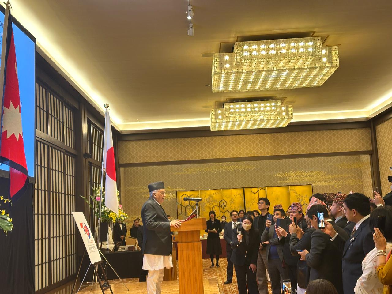 जापान (टोकियो) । राष्ट्रपति रामचन्द्र पौडेलले उत्पादन, जलविद्युत, पर्यटन, सेवा, सूचना प्रविधि, खानी र कृषिजस्ता नेपालको प्राथमिकताका क्षेत्रहरूमा लगानी गर्न धेरै भन्दा धेरै जापानी लगानीकर्ताहरूलाई आग्रह गरेका छन् । नेपाल र जापानबीच कूटनीतिक सम्बन्ध स्थापनाको ७०औं वार्षिकोत्सव मनाउन आज यहाँ आयोजित विशेष समारोहलाई सम्बोधन गर्दै उनले राजनीतिक मुद्दाहरूलाई निष्कर्षमा पुर्याएपश्चात्, नेपालको प्राथमिकता अब नेपाली जनताको द्रुत सामाजिक–आर्थिक विकास, प्रगति र समृद्धि हासिल गर्नुमा केन्द्रित रहेको छ भने । “नेपाल सरकारले व्यापार सहज बनाउन, विदेशी लगानी आकर्षित गर्न र नवप्रवर्तनलाई प्रवद्र्धन गर्न व्यापक कानुनी, प्रक्रियागत र संस्थागत सुधारहरू गरिसकेको छ, हामी उत्पादन, जलविद्युत, पर्यटन, सेवा, सूचना प्रविधि, खानी र कृषिजस्ता नेपालको प्राथमिकताका क्षेत्रहरूमा लगानी गर्न धेरै भन्दा धेरै जापानी लगानीकर्ताहरूलाई आमन्त्रण गर्न चाहन्छौं”, राष्ट्रपति पौडेलले भने । उनले आजको यो कार्यक्रमले हाम्रो सम्बन्धलाई नयाँस्तरमा पुर्याउन र आगामी वर्षहरूमा गहिरो र फलदायी द्विपक्षीय सहकार्यको लागि मार्ग प्रशस्त गर्ने विश्वास व्यक्त गरे । हाम्रो द्विपक्षीय सम्बन्धले राजनीतिक, आर्थिक, सामाजिक र सांस्कृतिक क्षेत्र मात्रै होइन जनता–जनताबीचको सम्पर्कलाई समेत समेटेको र यो क्रम विभिन्न समयमा हुने उच्चस्तरीय भ्रमणहरूको आदानप्रदान एवम् बढ्दो सहयोगमार्फत् थप सुदृढ हुँदै गएको उनको भनाई थियो । “नेपाल र जापानबीच विशेष गरी भगवान बुद्धको शिक्षामा आधारित संस्कृति, धर्म, मूल्यमान्यता र जीवनपद्धतिमा समानता छ, बुद्धको जन्मस्थल लुम्बिनीले नेपाल र जापानका जनताबीचको सम्बन्धलाई सुमधुर बनाउन बलियो पुलको काम गर्दछ, विश्व शान्तिको मुहानको रूपमा लुम्बिनीको विकासमा जापानको निरन्तर सहयोगप्रति हामी आभारी छौं”, राष्ट्रपति पौडेलले भने । उनले विकास सहायता, व्यापार, लगानी, पर्यटन र अन्य विभिन्न क्षेत्रमा जापान नेपालको एक प्रमुख साझेदार रहिआएको बताए । यस वर्षको अन्त्यसम्ममा नेपाल अति कम विकसित देशको तहबाट स्तरोन्नति हुने तथा २०३० सम्ममा मध्यम आय भएको देश बन्नु अर्को महत्वपूर्ण उपलब्धी हुने प्रसङ्ग उहाँले उल्लेख गरे । “त्यसैले, हामी राष्ट्रिय प्राथमिकताका क्षेत्रहरूमा थप विदेशी लगानी आकर्षित गर्ने, नेपालको व्यापार बढाउने, अन्तर–आवद्धता विविधीकरण गर्ने, पर्यटन प्रवद्र्धन गर्ने र उच्चस्तरीय प्रविधि प्राप्त गर्ने कुरामा ध्यान केन्द्रित गरिरहेका छौं”, राष्ट्रपति पौडेलले भने । नेपाल जापानीहरूको मनपर्ने पर्यटकीय गन्तव्य रहेकोमा उनले प्रसन्नता व्यक्त गरे । “साहसिक प