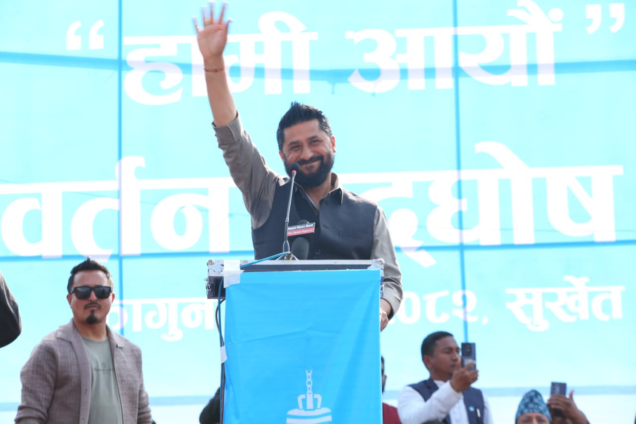 काठमाडौं । राष्ट्रिय स्वतन्त्र पार्टीका सभापति रवि लामिछाने सबै दलहरु एक भएर रास्वपासँग भिड्न चुनौती दिएका छन् । बिहीबार सुर्खेतमा आयोजित ‘हामी आयौं’ परिवर्तन उद्घोष सभालाई सम्बोधन गर्दै उनले कसको कति मान्छे आए भनेर रास्वासँग फोटो भिडाउने काम भएको भन्दै चुनावमा भिड नभई मतपत्र भिडाउने बताए । उनले भने, ‘यहाँ कसको कति मान्छे आए भनेर फोटो भिडाउँदै छन् । आएनन् हाम्रो मान्छे भयो तपाईकै मान्छे आए । चुनावमा मतपत्र भिडाउने हो । भिड भिडाउन हामीलाई जरुरी छैन । हामी निर्वाचनबाट भाग्य बदल्ने काममा लागेको छौं । त्यो विश्वास पनि जनताको हो । अर्को एउटा अफर छ अहिले त्यस्तो पीर छ लोकतन्त्रको भने भए भरको सबै मिल्नुहोस् । एउटा दल बनाएर चुनाव लड्नुहोस् । अल भर्सेल वान । घण्टी भर्सेस अल । जतिबेला जनता जाग्यो त्यतिबेला कचकच गर्न पाइँदैन् । रास्वपासँग डराउनुपर्ने को त्यो डराओस् । जनता डराउनुपर्दैन् ।’ त्यस्तै अहिले चुनाव गर्नुहुँदैन चुनावले निकास दिँदैन भन्ने प्रतिक्रिया आइरहेको बताउँदै उनले जनताले भोटबाट आफ्नो तागत देखाउने यो उत्सवले नदिएर के ले निकास दिन्छ भन्दै प्रश्न गरे । रोडबाट भए रोडबाट, भोटबाट भए भोटबाट आउनुहोस् भनेर अफर गर्दै आफूहरुले रोडभन्दापनि भोटबाट परिवर्तन चाहेको धारणा राखे । ‘अहिले चुनाव गर्नुहुँदैन, चुनाव सार्नुपर्छ भन्ने कुरा मैले कतै सुनिरहेको छु । चुनावले निकास दिँदैन भनेको सुनेको छु । चुनावले निकास दिँदैन भने के ले दिन्छ निकास ? लोकतन्त्रको ठूलो तागत जनताको तागत हो । जनताले भोटबाट आफ्नो तागत देखाउने यो उत्सवले नदिएर के ले दिन्छ ? आन्दोलनले ? एउटा अफर कर्णालीबाट गर्न चाहन्छु । रोडबाट भए रोडबाट भोटबाट भए भोटबाट आउनुहोस् । हामी चाहन्छौं भोटबाट परिवर्तन,’ उनले भने । सभापति लामिछानेले लोकतन्त्रलाई खतरा भएकाहरु हेलिकप्टर चडेर भागेको छ भन्दै त्यो सिंहदरबार र बालुवाटारमा ल्याण्ड भएमात्र फेरी खतरा पैदा हुने टिप्प्णी गरे । परिवर्तनको आगोको झिल्कोलाई र जनताको चेतानालाई कसैले चेतावनी दिन नसक्ने दाबी गर्दैै उनले लोकतन्त्रलाई जोगाउने ठेक्का कुनै नेता र पार्टीले लिन नपर्ने बताए । उनले भने,‘लोकतन्त्रको खतराको घण्टी बल्ल बज्यो ?जब जनता जागे तब तपाईहरुलाई लाग्यो खतरा छ । लोकतन्त्रलाई जुन खतरा थियो ।त्यो खतरा हेलिकप्टर चडेर भागेको छ वस् ल्याण्ड नहोस् । लोकतन्त्रलाई जब खतरा हुन्छ तब त्यो हेलिकप्टर सिंहदरबार र बालुवाटारमा ल्याण्ड हुन्छ । परिवर्तनको यो आगोको झिल्कोलाई जनताको चेतानालाई कसैले चेतावनी नदियोस् । लोकतन्त्रलाई खतरा छैन हामी जोगाउँछौं । कुनै नेताले ठेक्का लिनुपर्छ लोकतन्त्रको ? कुनै नेता र पार्टीले ठेक्का लिनुपर्देन जनताले बचाउँछ