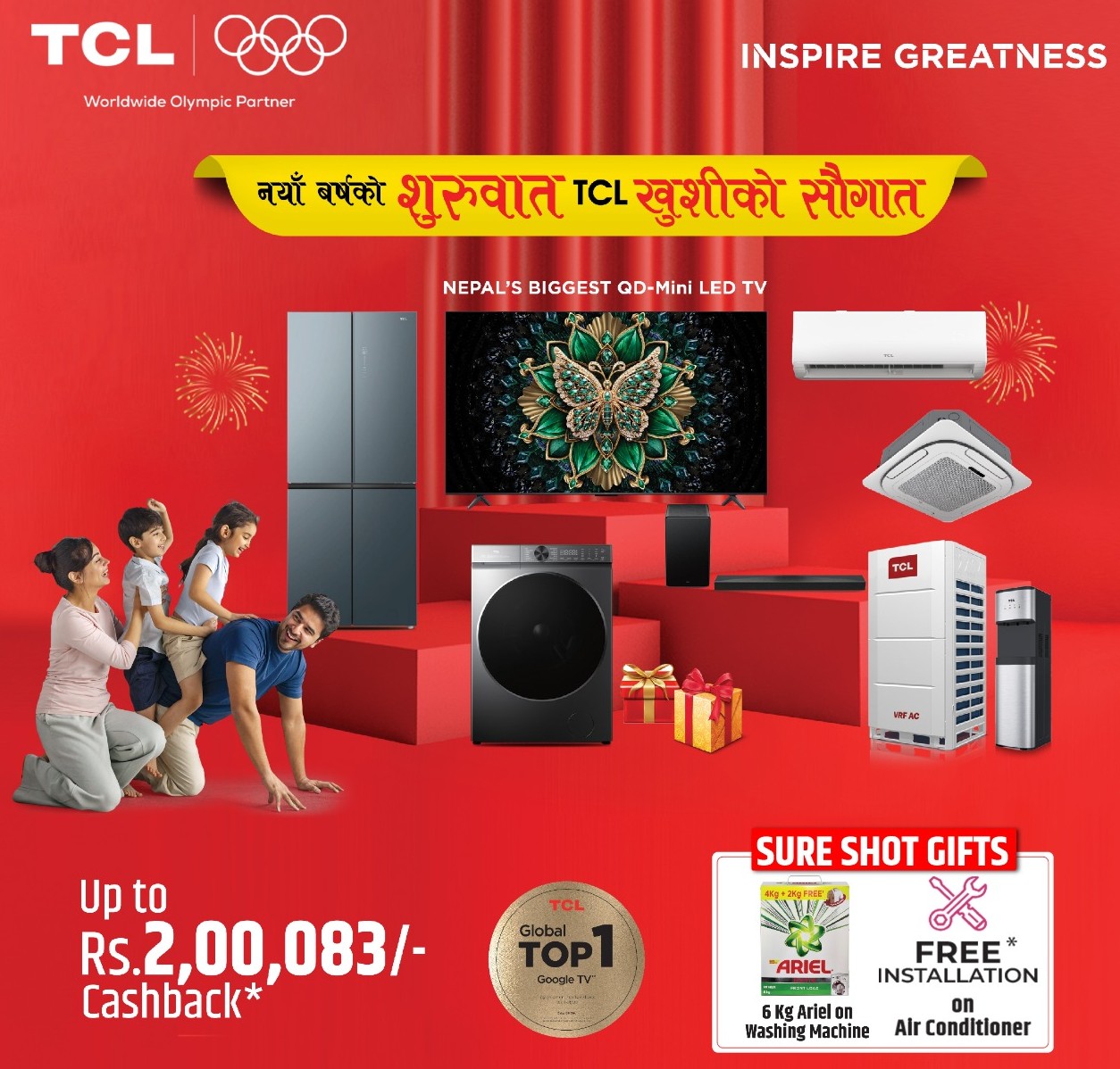 काठमाडौं । विश्वप्रसिद्ध इलेक्ट्रोनिक्स ब्रान्ड टीसीएलले नयाँ वर्ष २०८३ को अवसरमा नेपाली ग्राहकहरूका लागि ‘नयाँ वर्षको सुरुवात, टीसीएल खुशीको सौगात’ नामक विशेष उपहार योजना सार्वजनिक गरेको छ । यस योजनामार्फत कम्पनीले आफ्ना ग्राहकहरूलाई अत्याधुनिक प्रविधियुक्त होम अप्लायन्स र टेलिभिजनको खरिदमा विशेष लाभ र उत्साह प्रदान गर्ने उद्देश्य राखेको छ । योजना अन्तर्गत ग्राहकहरूले टीसीएलका विभिन्न उत्पादनहरू खरिद गर्दा २,००,०८३ रुपैयाँ सम्मको आकर्षक क्यासब्याकका साथै हरेक खरिदमा तत्कालै प्राप्त हुने ‘स्योर सट’ उपहारहरू सुनिश्चित गरिएको छ । यस विशेष अफरमा नेपालकै सबैभन्दा ठूलो क्युडी–मिनी एलईडी टिभी, अत्याधुनिक रेफ्रिजेरेटर, वाशिङ मेसिन, स्प्लिट तथा क्यासेट एयर कन्डिसनर, भीआरएफ सिस्टम र साउन्ड सिस्टम जस्ता आधुनिक उपकरणहरू समावेश गरिएका छन् । ग्राहकहरूको सुविधाका लागि कम्पनीले वाशिङ मेसिनको खरिदमा ६ केजी एरियल डिटर्जेन्ट उपहार दिने र एयर कन्डिसनर खरिदमा निःशुल्क जडानको व्यवस्था मिलाएको छ । साथै, सीजी एलेक्समार्फत ‘नागरिकता भए पुग्छ’ भन्ने सरल प्रक्रियाका आधारमा शून्य प्रतिशत ब्याजदरमा ईएमआई सुविधासमेत उपलब्ध गराइएको छ, जसले ग्राहकहरूलाई खरिद प्रक्रियामा थप सहजता प्रदान गर्नेछ । विश्वव्यापी रूपमा गुणस्तर प्रमाणित गरी ‘ग्लोबल टप १’ ब्रान्डको रूपमा स्थापित टीसीएल अन्तर्राष्ट्रिय ओलम्पिकको समेत साझेदार रहेको छ । नेपालमा सीजी इलेक्ट्रोनिक्समार्फत उपलब्ध यी अफरहरू देशभरका आधिकारिक शोरुम तथा डिलरहरूमा सीमित अवधिका लागि मात्र लागू हुने कम्पनीले जनाएको छ । नयाँ वर्षलाई थप स्मार्ट, सहज र आधुनिक बनाउन विश्वस्तरीय प्रविधि घरमा भित्र्याउन चाहने ग्राहकहरूका लागि यो एक उत्कृष्ट अवसर हुने विश्वास गरिएको छ ।